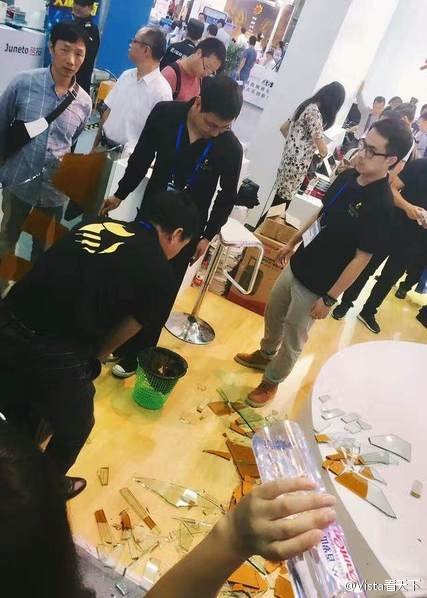 机器人小胖突然砸碎玻璃,造成1人受伤。