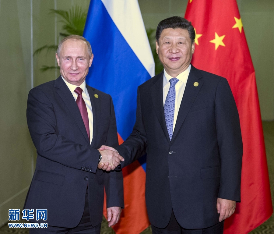 普京表示,很高兴再次同习近平主席会晤,俄中高水平的关系对全球和平稳定十分重要,双方应该保持密切高层交往。当前,俄中双边经贸关系发展势头良好,高新技术等领域合作取得积极成果。俄方期待着同中方共同推进欧亚经济联盟建设同“一带一路”建设对接合作。俄中双方要加强在亚太经合组织等多边事务中协调合作。