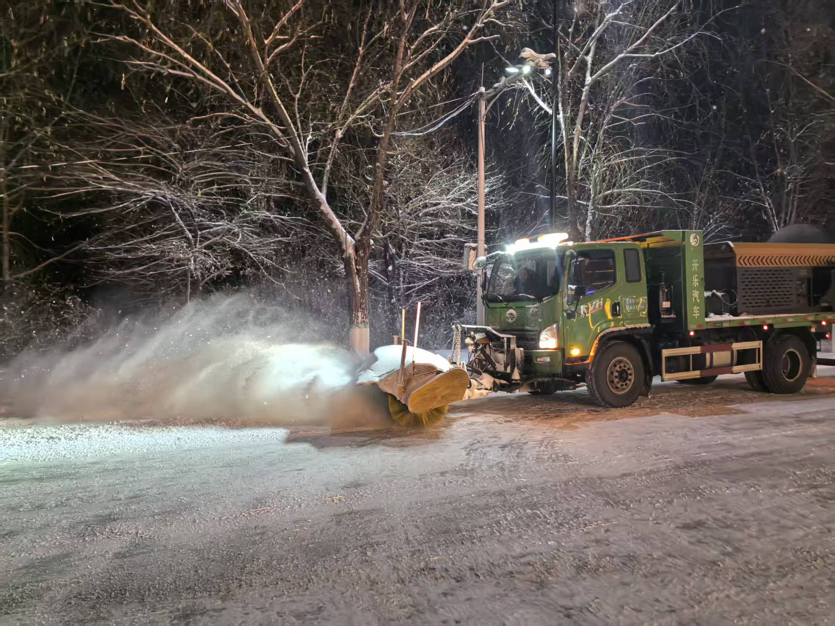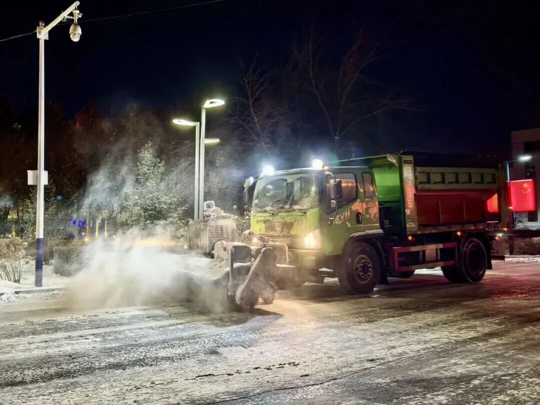 岭东区以雪为令,迅速组织150余名环卫工人和多台清雪车辆设备,在降雪的第一时间进行清冰除雪,临街商户与各小区物业人员也积极响应,同步投入清雪行动,共同为保障群众出行安全贡献力量。在收到预警信息后,全区各责任单位立即到岗到位,紧盯交通、电力、通讯、农业农村等重点民生和社会经济运行领域,加强部门协调与联动配合,全力确保水电气热保供和道路交通畅通。同时,在重点区域和重要场所提前预置抢险救援力量、物资和装备,及时实施扫雪除冰和交通管控等措施,做到早安排、早部署,切实维护全区生产生活秩序稳定。