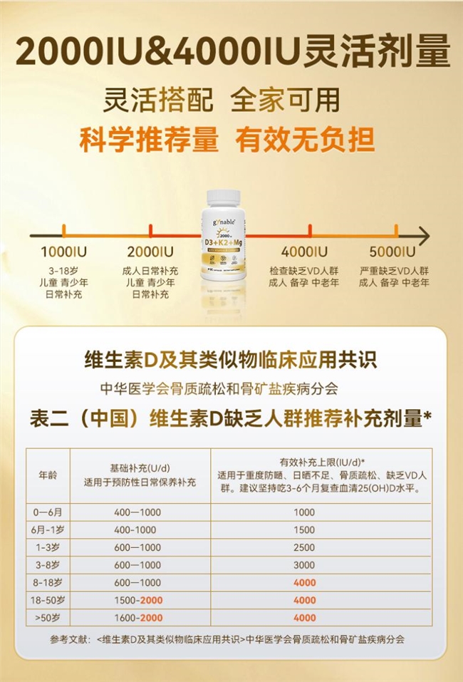 面对普遍缺乏,是否“剂量越大越好”?全球权威机构给出了明确答案。欧洲食品局(EFSA)、英国医学研究所(IOM)、美国内分泌学会(USES)及中国医学科学院(CAMS)等机构基于大量研究共识指出,对于成人日常补充,每日2000-4000国际单位(IU)的维生素D是安全且有效的理想范围。洁妮贝维生素DK镁的剂量设计严格遵循此共识:每粒含2000IU维生素D3,建议每日补充1-2粒。这一灵活设计,既能使日常补充轻松落在安全范围内,也能在检测发现严重缺乏时,在专业人士指导下短期采用更高剂量方案,实现了 “精准满足需求”与“恪守安全上限” 的完美平衡。