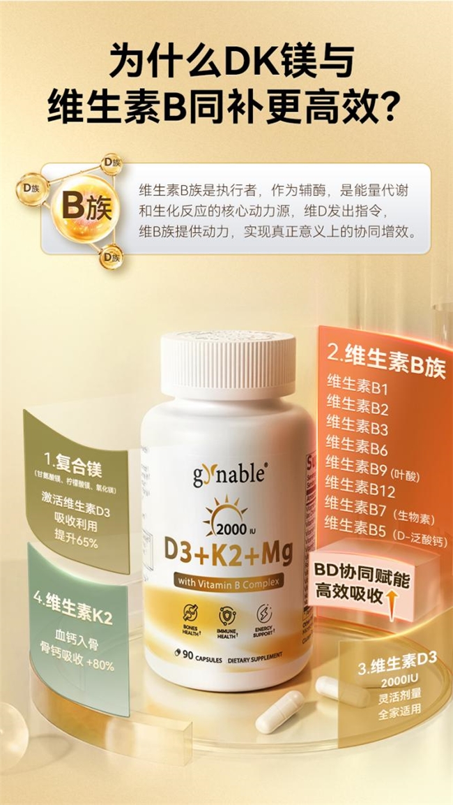 洁妮贝维生素DK镁一次性解决了这三大痛点,其“D3+K2+镁+全谱B族”的四合一科学配方,构建了一个完整的营养支持系统。