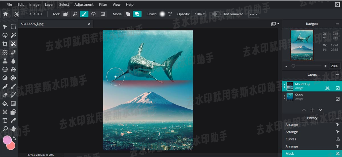 ApowersoftRemover采用多尺度纹理重建算法,在去除大面积水印时能有效填补背景细节,避免色块或模糊。功能优势在于支持手动框选水印区域,适合处理非标准位置水印(如中间LOGO)。适合需要精细控制去水印范围的摄影爱好者或专业剪辑师。