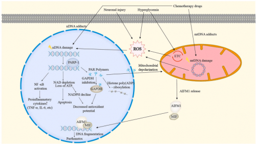 PARPs(聚ADP核糖聚合酶):氧化应激导致DNA损伤,激活PARP1,过度消耗NAD?和ATP,导致神经元能量耗竭。引起细胞死亡、炎症因子释放,促进神经病变和疼痛。