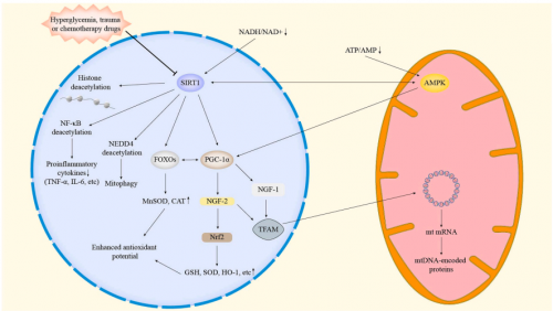 2. SIRT1的活性抑制——细胞保护机制的失灵 SIRT1是重要的神经保护因子,但其活性高度依赖NAD+水平。当NAD+因PARP1过度激活等原因而耗竭时,SIRT1活性受抑制,导致: ? 表观遗传失调:组蛋白乙酰化水平升高,促进疼痛相关基因(如NALP1)的表达。 ? 线粒体功能障碍:无法有效激活PGC-1α,导致线粒体生物合成和功能受损,能量产生不足。 ? 抗氧化能力下降:削弱Nrf2通路,使神经元更易受氧化损伤。 ? 炎症失控:无法有效抑制NF-κB,加剧神经炎症。