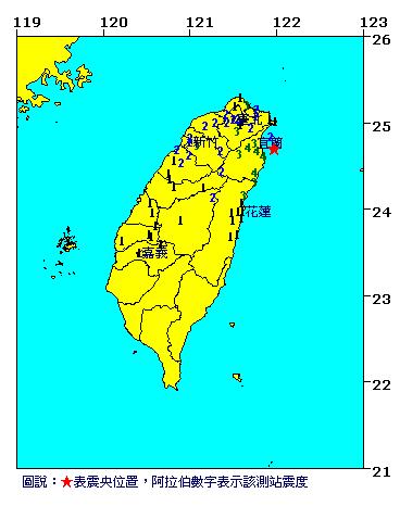 中新网5月13日电 据台湾“气象局”网站消息,13日16时24分,台湾东部海域发生里氏规模5.1级地震。地震深度15.9公里,各地最大震度,宜兰县苏澳4级、新北市新店3级、花莲县和平3级、台北市2级。