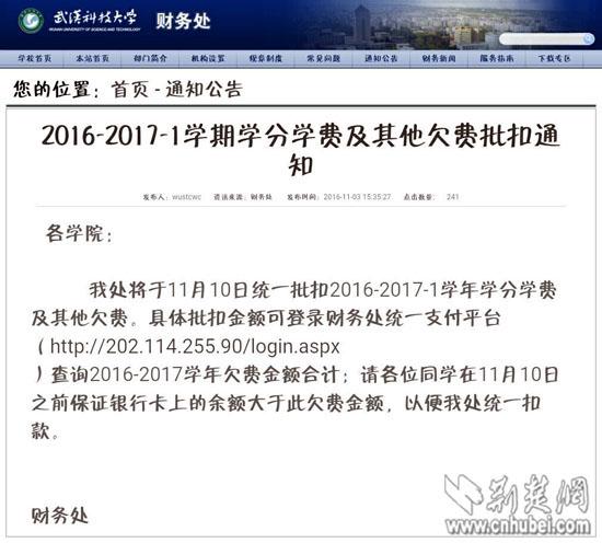 荆楚网消息 “将于11月10日统一批扣2016-2017-1学年学分学费及其他欠费,请各位同学在11月10日之前保证银行卡上的余额大于此欠费金额,以便我处统一扣款……”武汉科技大学财务处的一则通知,让该校积极备战“双十一”的同学们猝不及防,狂呼“终于知道什么叫做计划赶不上变化”。