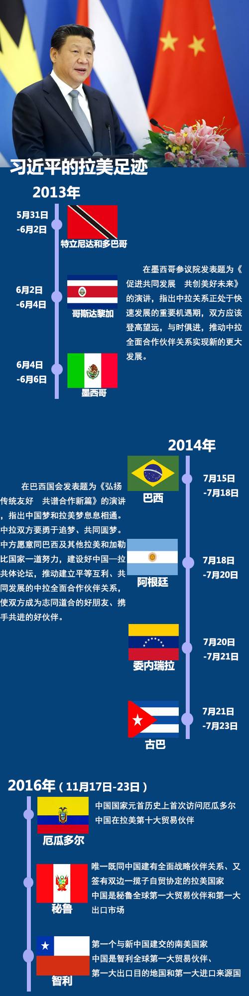 4、中拉关系五位一体新格局当前,中拉关系正处于历史最好时期,站在了新的历史起点上。中拉深化全面互利合作面临更好机遇、具备更好基础、拥有更好条件,完全有理由实现更大发展。在此,我提议,通过这次会晤,共同宣布建立平等互利、共同发展的中拉全面合作伙伴关系,努力构建政治上真诚互信、经贸上合作共赢、人文上互学互鉴、国际事务中密切协作、整体合作和双边关系相互促进的中拉关系五位一体新格局。——2014年7月17日在中国——拉美和加勒比国家领导人会晤上的主旨讲话
