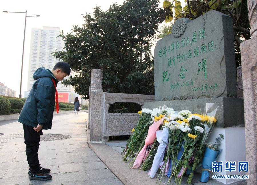 12月12日,一名小学生在侵华日军南京大屠杀汉中门外遇难同胞纪念碑前鞠躬。