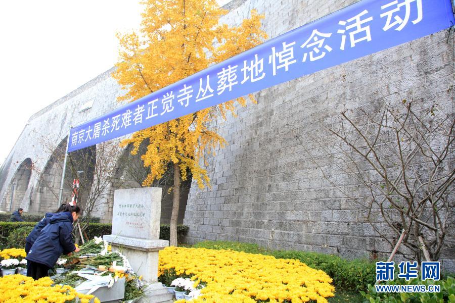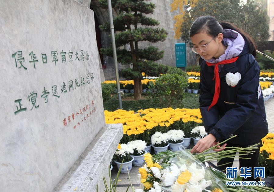 12月12日,在侵华日军南京大屠杀死难同胞丛葬地(正觉寺),参加悼念活动的小学生向遇难同胞纪念碑献花。