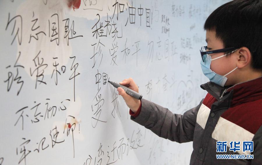 12月12日,在南京地铁云锦路站,一名小学生在“南京大屠杀死难者国家公祭日和平许愿墙”上书写自己的和平心愿。