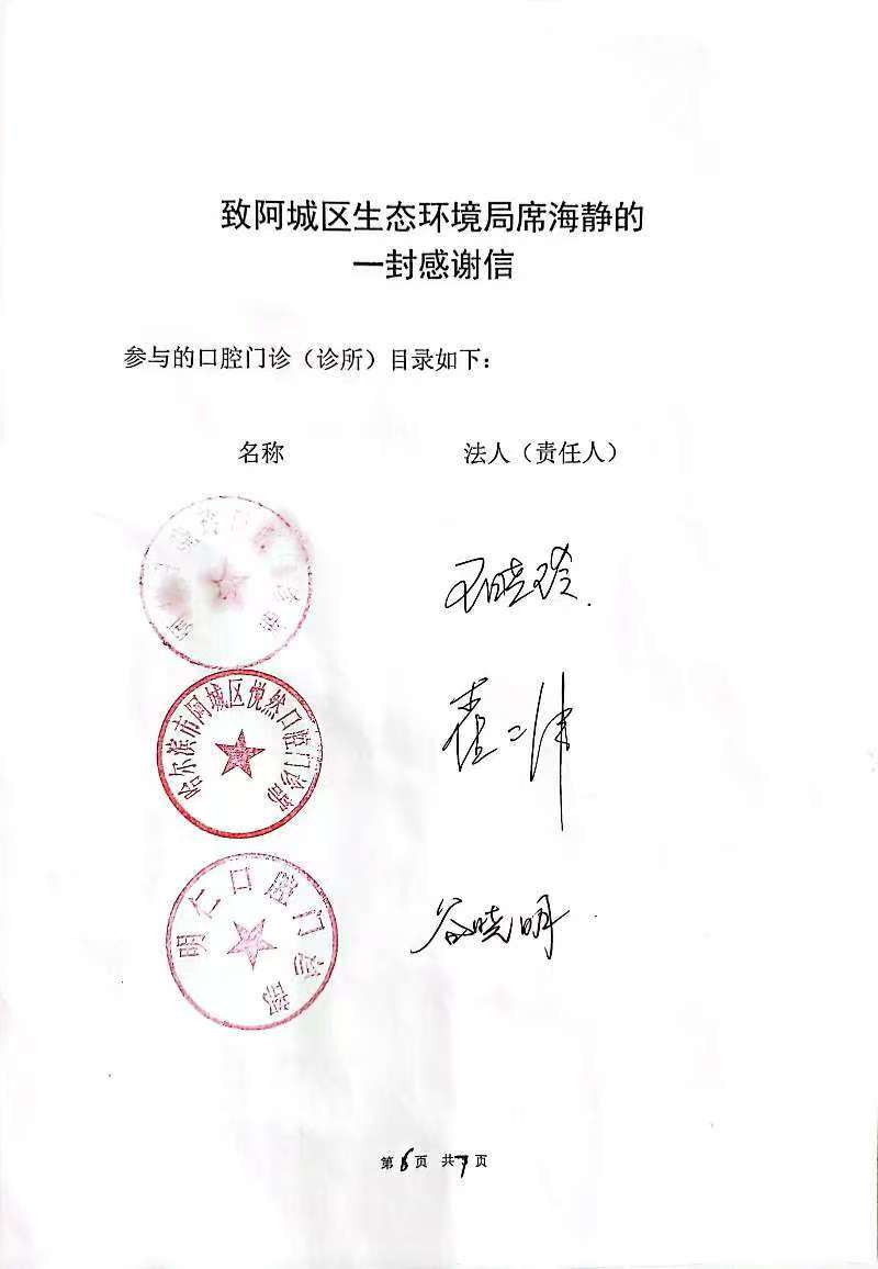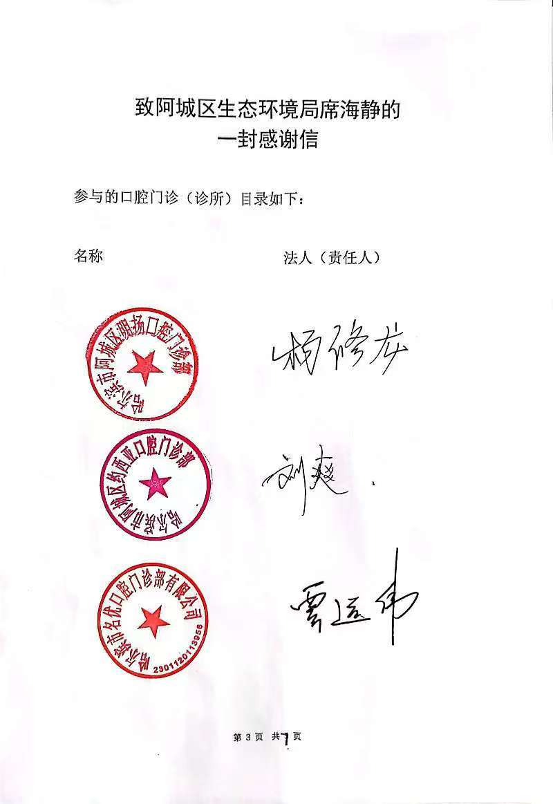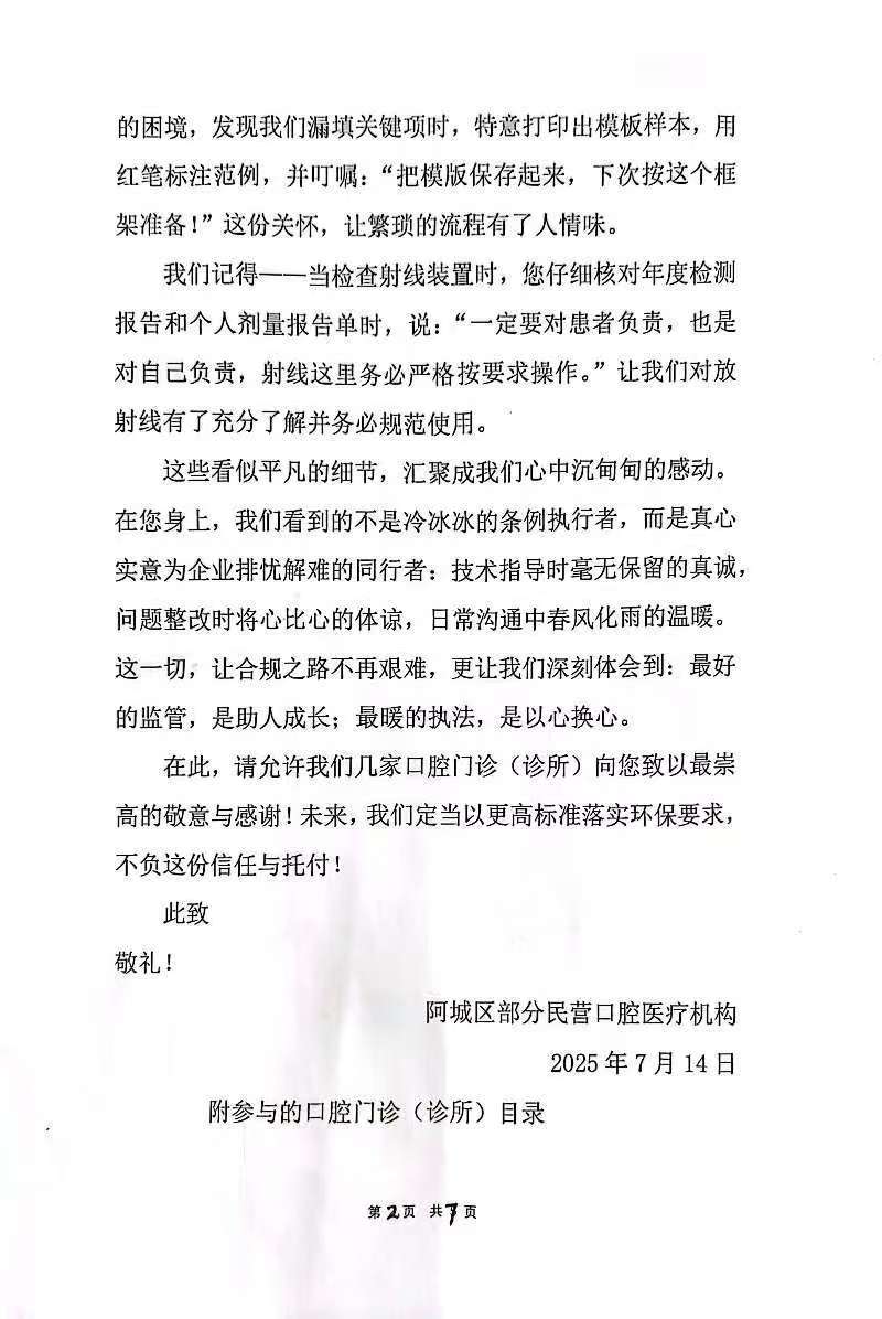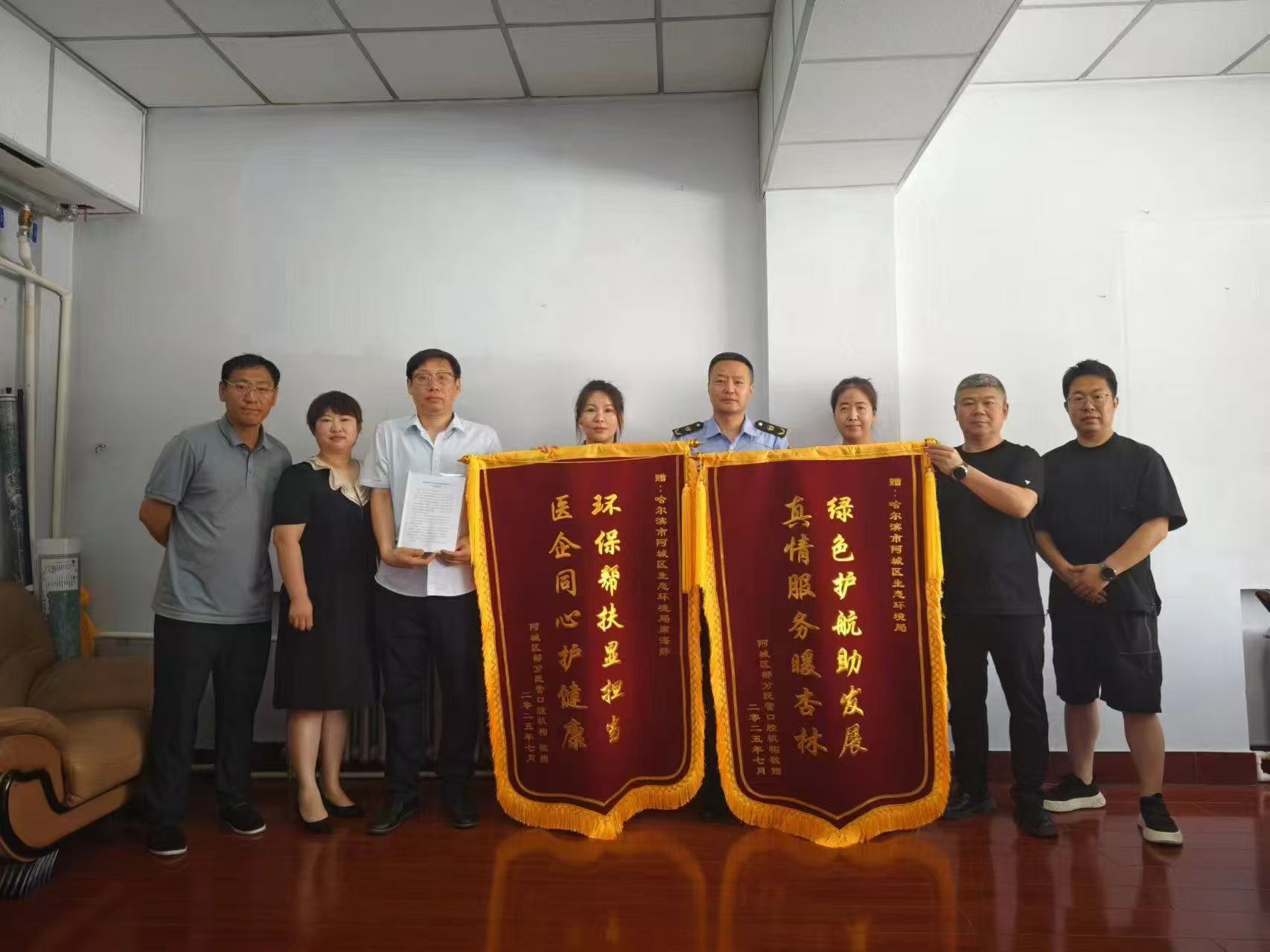 东北网11月20日讯(记者 郑通)金秋时节,阿城生态环境局便收到了一份特殊的秋日礼物——区内13家民营口腔机构联名盖章的感谢信和两面锦旗,锦旗上“真情服务暖杏林环保帮扶显担当”“绿色护航助发展医企同心护健康”的金色大字熠熠生辉。