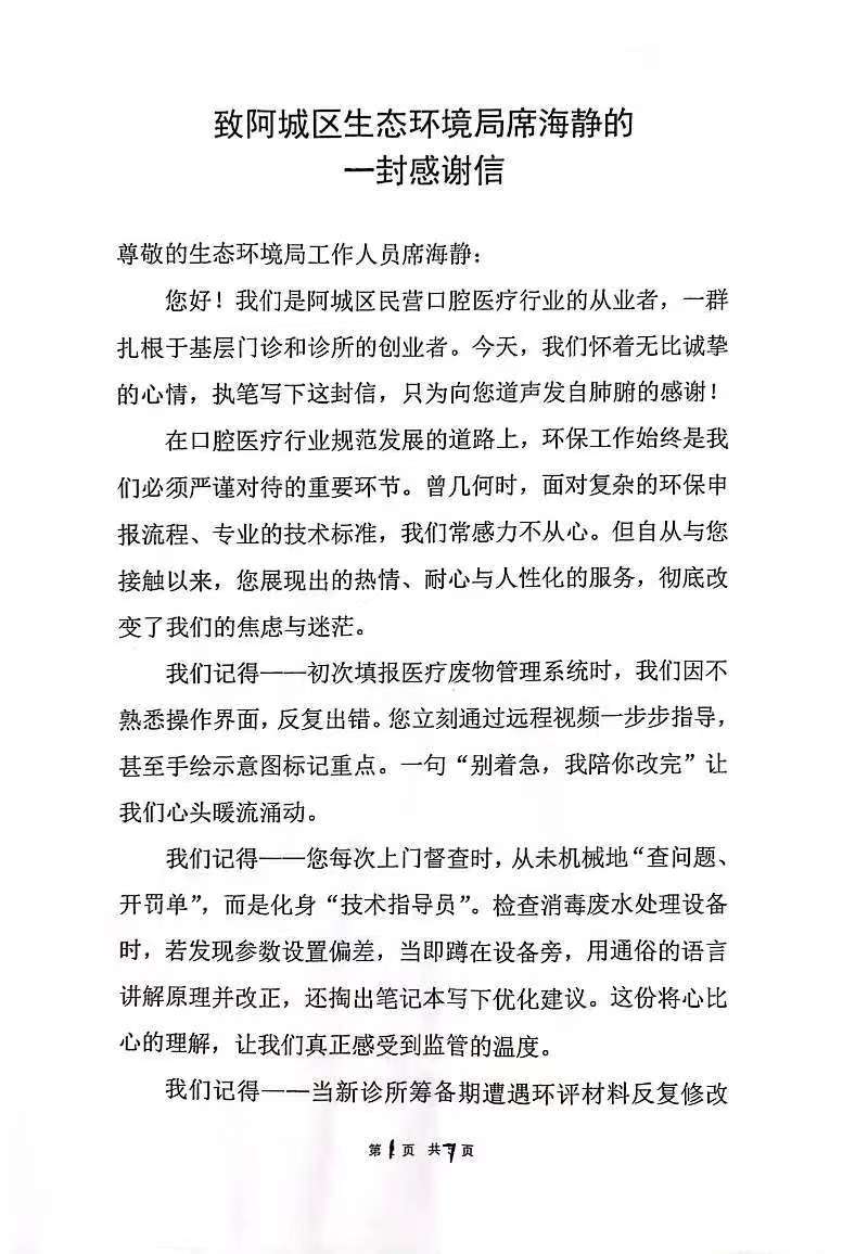 医疗废水处理、放射性装置管理、医疗废物安全处置等环节,一直是民营口腔医疗机构经营过程中的难点。阿城生态环境局执法人员以帮扶代替监管,赢得了民营机构的高度赞誉,成为生态执法从“监管者”向“护航者”转型的生动实践,也为优化区域营商环境树立了典范。特别是执法一中队队长席海静同志作为“环保联络员”,发挥了先锋模范作用。