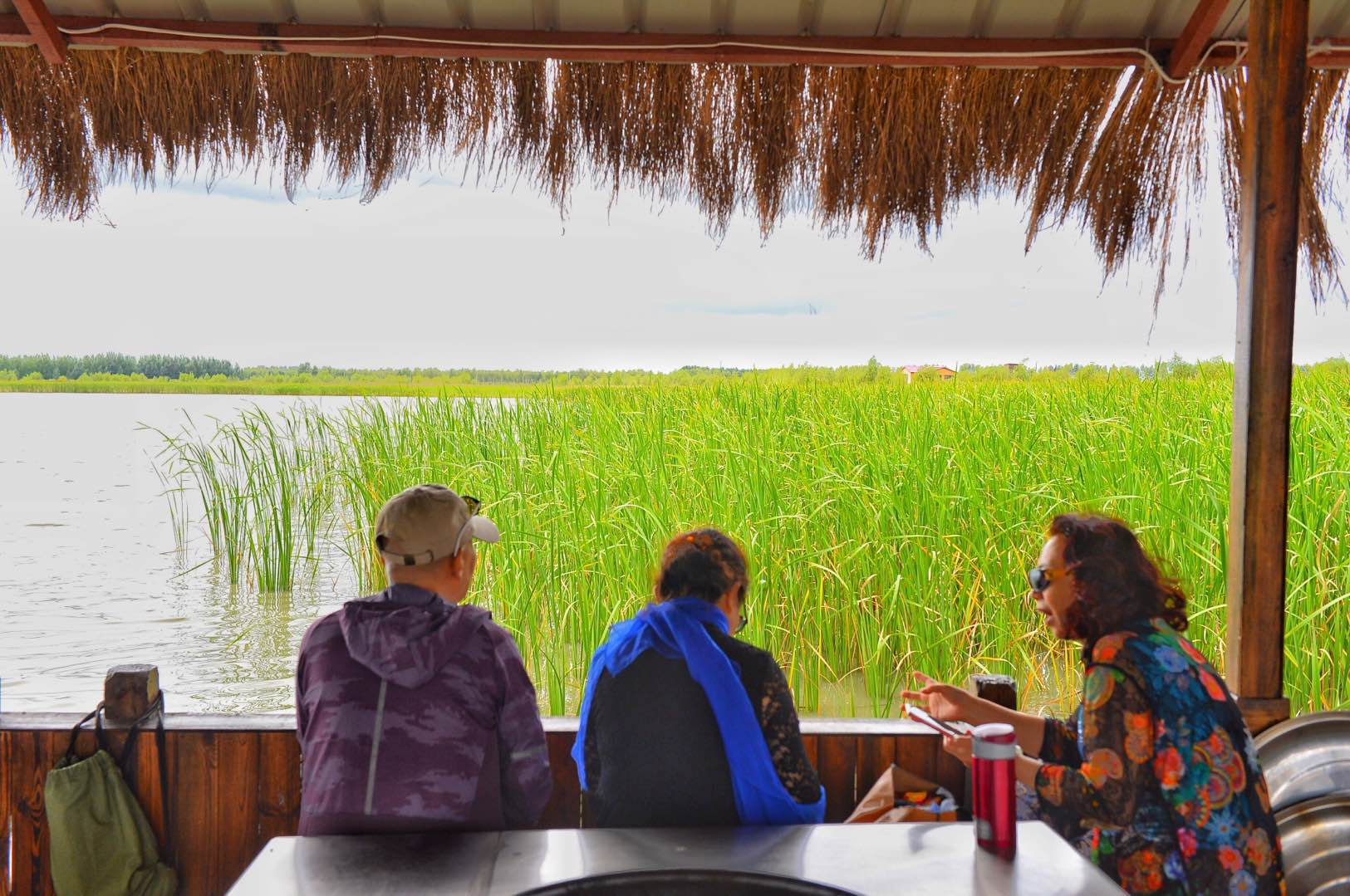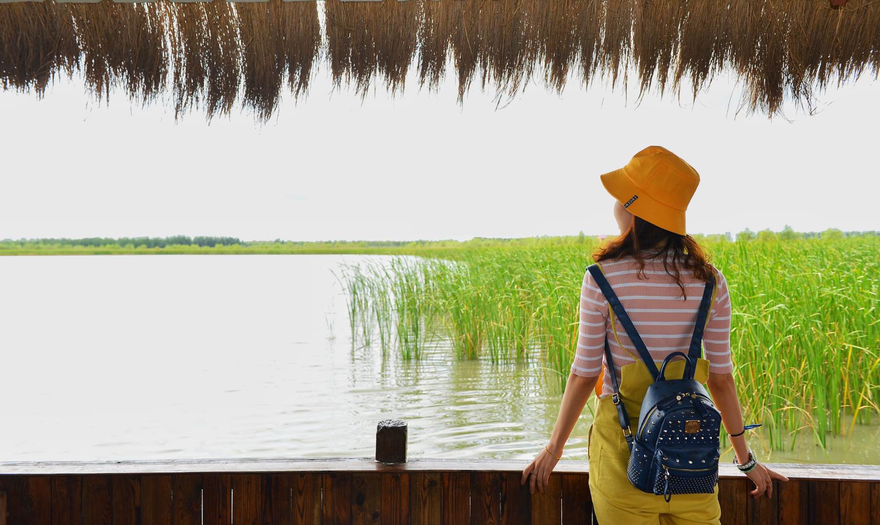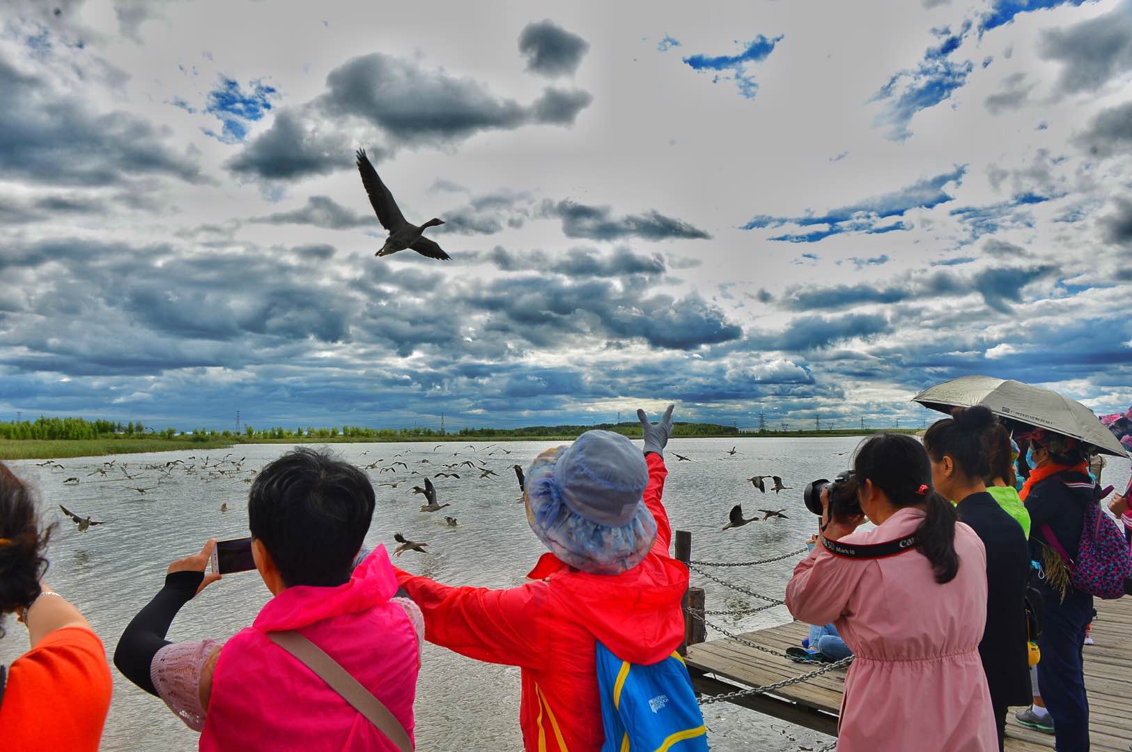 下午一时五十分许,伴着芦香,顺着湿地内的木栈道来到一处开阔的码头上,一些常来的游客已经早早等在那里,因为再有10分钟,就是放飞大雁的壮观时刻。