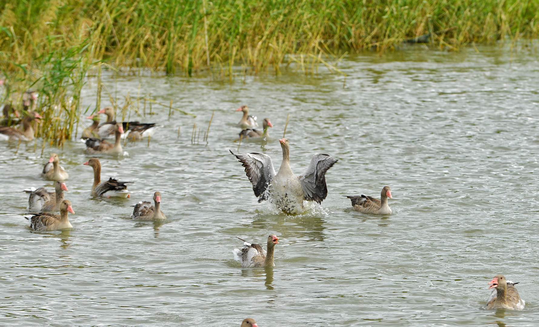 两点一到,随着两声嘹亮的哨响,在一艘快艇的领航下,“嘎嘎嘎”,近百只大雁排着整齐的队列冲天而起,在游人上空盘旋两圈多才陆续落到水面觅食。