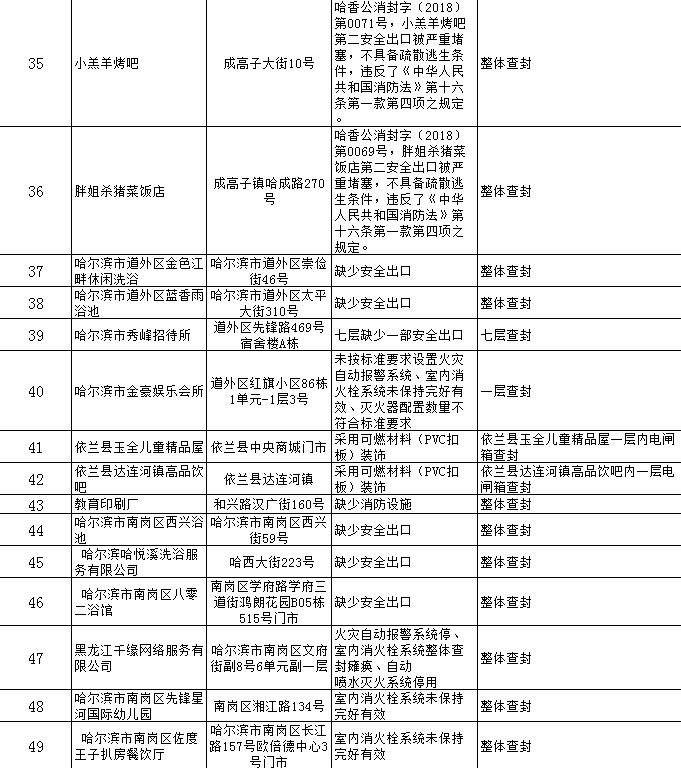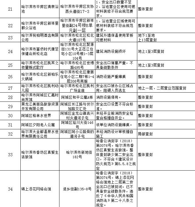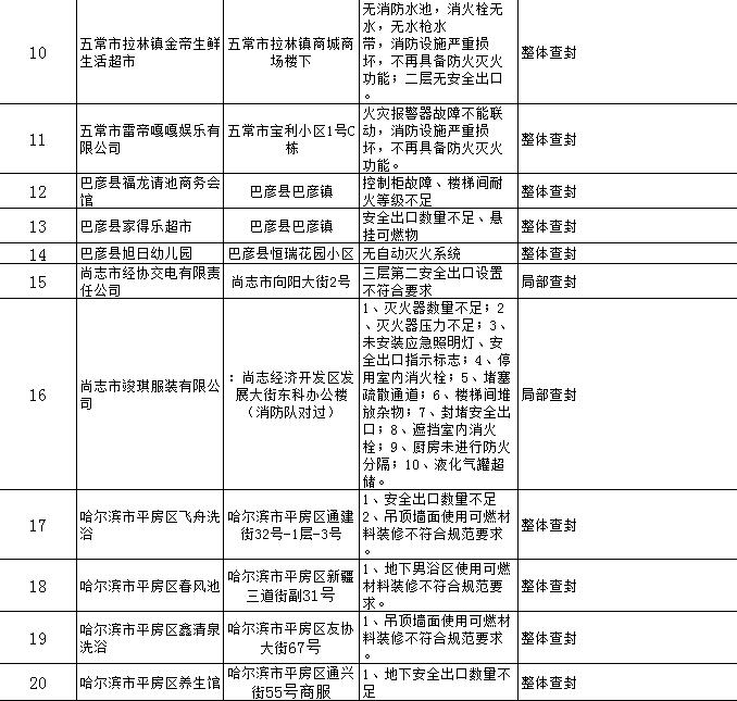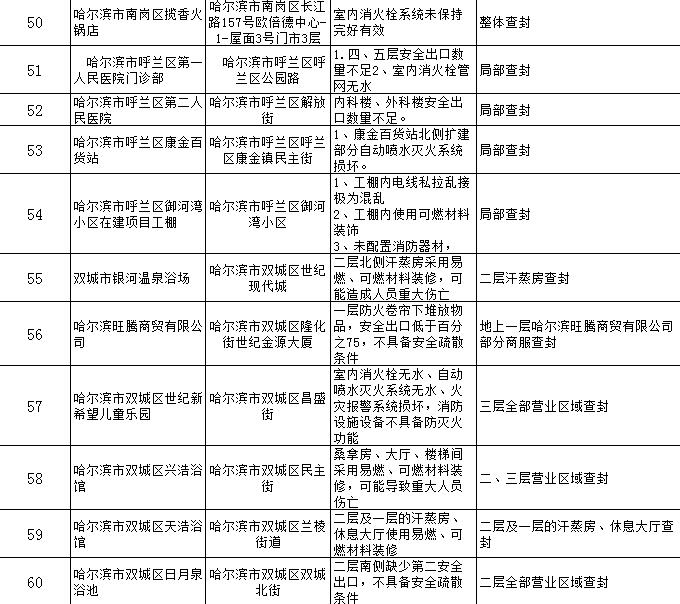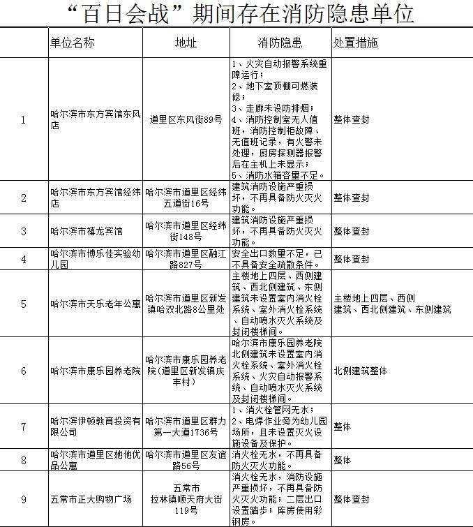 哈尔滨市消防支队对公众聚集场所和人员密集场所进行重点排查,深入细致排查社会单位存在的消防安全隐患问题,强力确保全市火灾形势平稳。现将“百日会战”期间存在严重火灾隐患的社会单位公示如下: