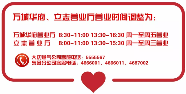 万城华府、立志燃气营业厅营业时间已调整,具体时间请看