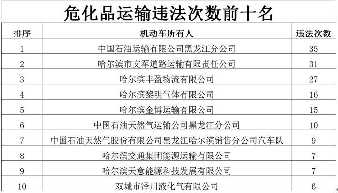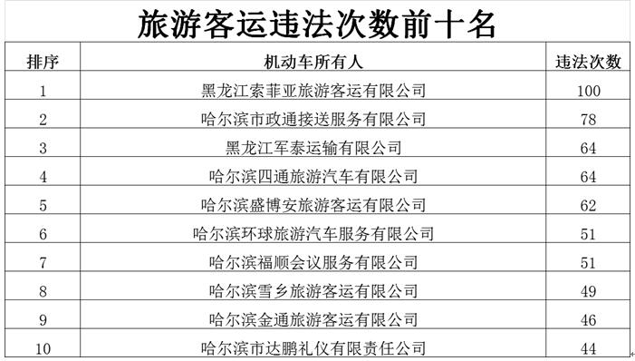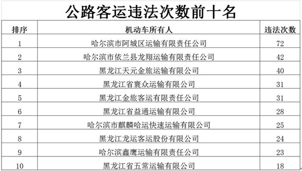 东北网1月24日讯(记者 陈南竹)记者从省交警总队获悉,春运期间,为营造我省良好的道路交通环境,深入推进“百日安全行动”,全力防范和遏制重特大道路交通事故的发生。黑龙江省公安厅交警总队部署各地交警部门针对公路客运、旅游客运、货运、危险品运输车等重点车辆持续形成高压管控态势,严查各类交通违法行为,并对2018年度交通违法较多的客运、货运及危险品运输车企业予以公布,提示重点运输企业负责人及驾驶人应严格规范企业内部管理制度,依法履行安全职责,遵守道路交通法律规定,安全守法出行。