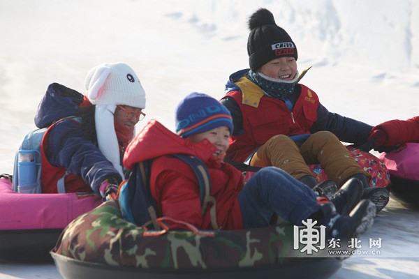 在“赏冰玩雪全体验做龙江冰雪代言人”东北网小记者冰雪文化体验营开营仪式后,小记者们首先体验了欢乐大雪圈项目,他们4人一组,乘着雪圈从雪坡上呼啸而下,高兴得大声欢呼。
