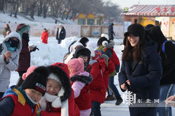 接着,东北网小记者团队一行40余人,进入了“2019哈尔滨江上大众冰雪嘉年华”的欢乐冰雪拓展区域,工作人员将小记者们分成A、B两组进行了三局两胜的冰上拔河比赛,随着一二一二的口号加油声,B组同学赢得了冰上拔河比赛的胜利。“我感觉到了拔河比赛团结协作的力量。”“我觉得冰上拔河的胜负完全取决于鞋子的防滑程度,与陆地上的拔河感觉不同,鞋子滑得站不住。”比赛后,小记者们纷纷表达着自己的想法。