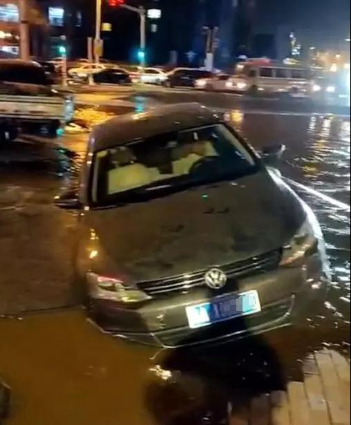 群力观江国际小区一位居民告诉记者,其在18时许看到小区旁边地面不仅大量跑水,还有车被困在路面塌陷处。