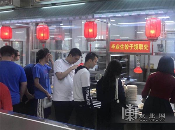 同时,哈尔滨理工大学在毕业生离校前夕,在食堂设立了独立窗口,为毕业生送出“上车”饺子。一张印有“时光不老、我们不散”的毕业饺子券感动了众多毕业生。一名同学在“食堂饭菜伴随四年奋进,毕业饺子祝福锦绣前程”的宣传板前合影留念,久久不肯离去。他说,“吃完这顿饺子,我将踏上去往工作城市的火车,我一定要努力工作,为学校争光。”