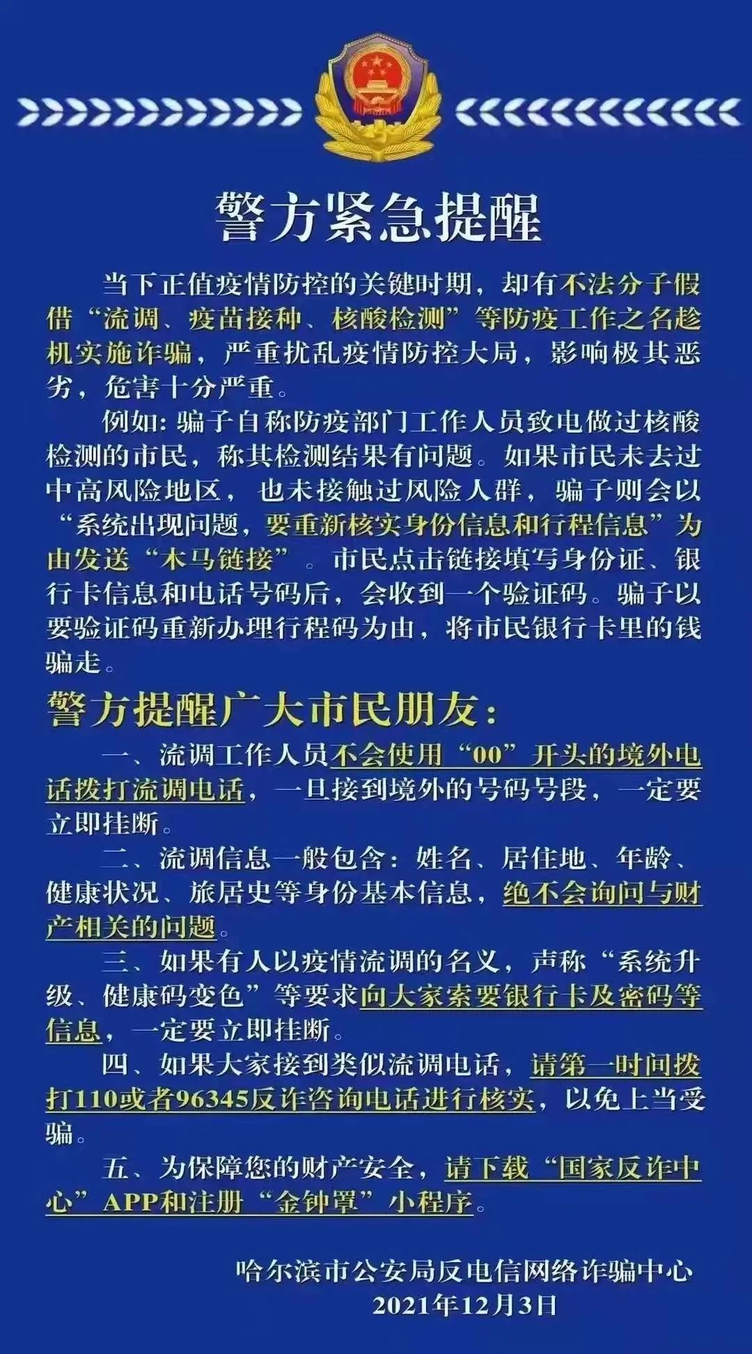 当下正值疫情防控的关键时期,却有不法分子假借“流调、疫苗接种、核酸检测”等防疫工作之名趁机实施诈骗,严重扰乱疫情防控大局,影响极其恶劣,危害十分严重。