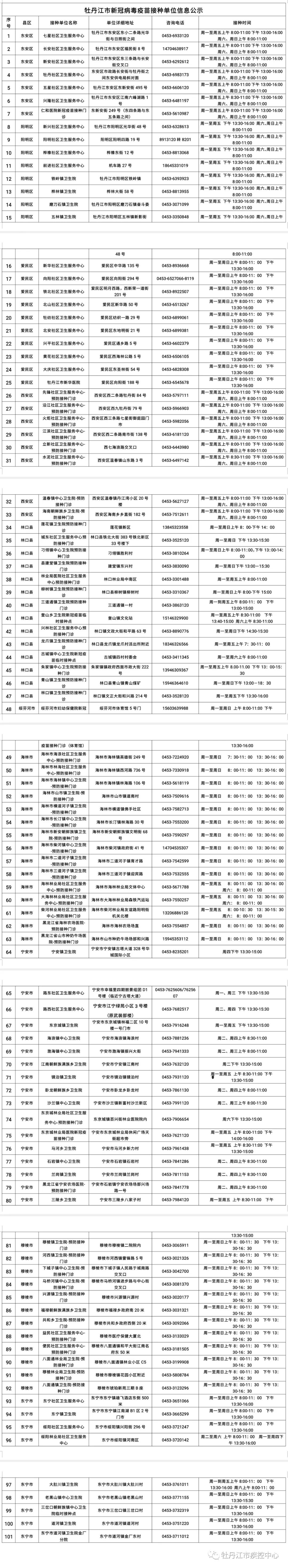 为方便广大市民特别是老年人接种新冠疫苗,获得规范、及时、安全的预防接种服务和预防接种知识,现将牡丹江市101家新冠疫苗接种点名称、地址、联系电话、服务时间安排公布如下,望广大市民知悉(详见下表)。