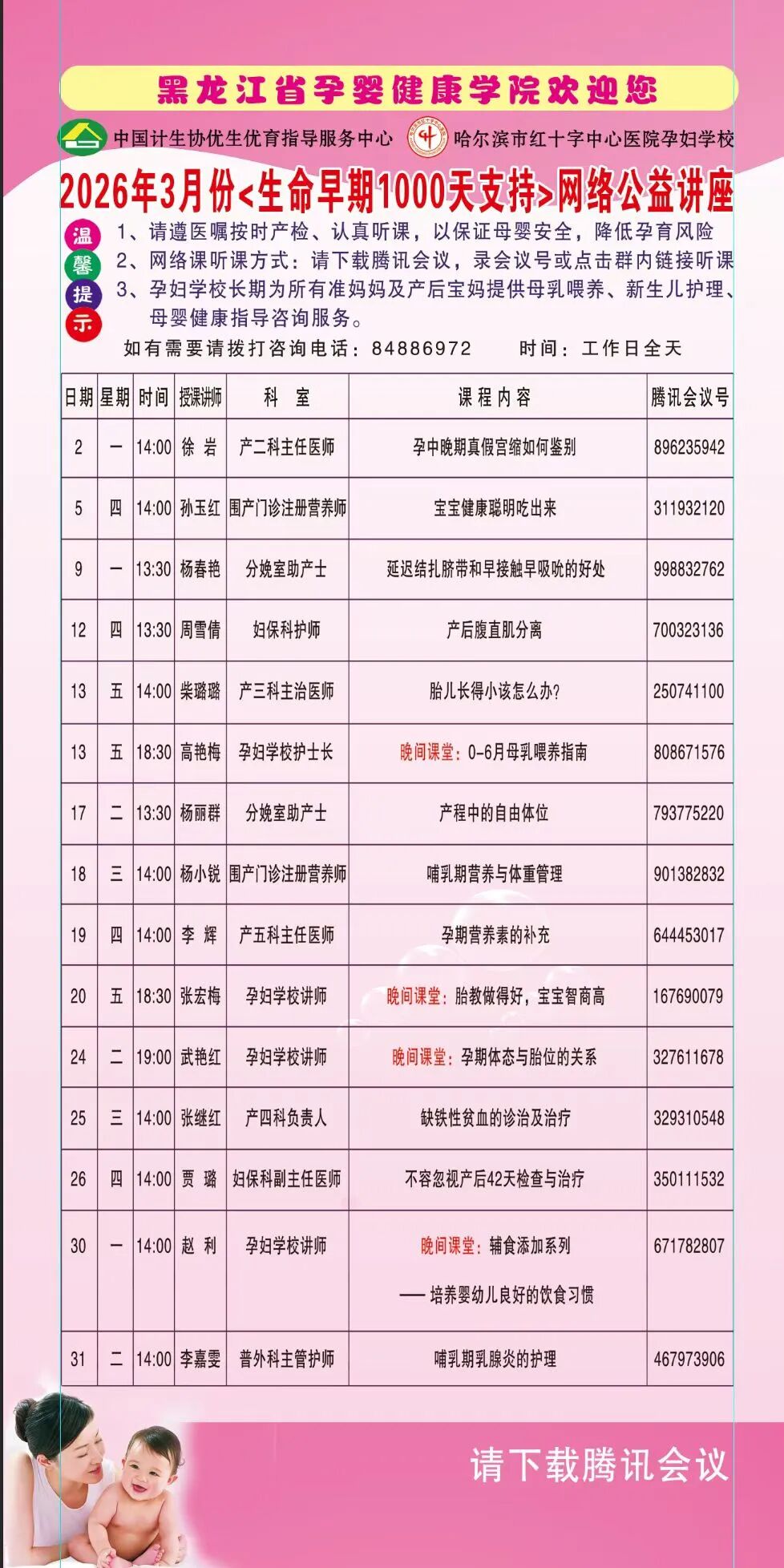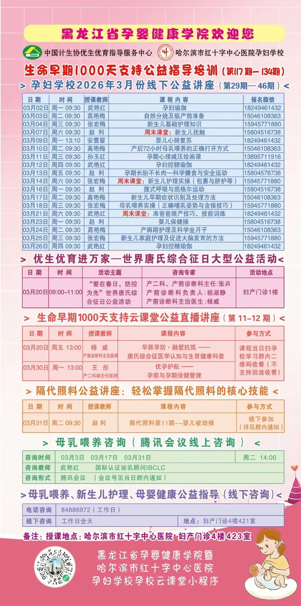 为了让医疗服务更暖心、贴心,中国计生协优生优育指导服务中心——黑龙江省孕婴健康学院暨哈尔滨市红十字中心医院孕妇学校开设生命早期1000天支持公益指导培训课程,现为您奉上孕妇学校2026年3月学习课程表,课程涵盖母乳喂养技巧训练营、新生儿护理实操训练营、自然分娩体验营、孕期及哺乳期饮食指导等内容,请各位准爸妈们按需选择课程。