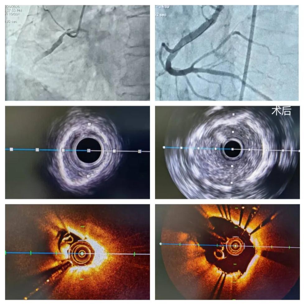 68岁患者姜先生因持续性胸痛来到我院心血管病五科就诊。入院后完善相关检查后,明确诊断为“急性心肌梗死”。为精准评估冠状动脉病变的特征,科室介入团队立即为其进行冠状动脉造影检查,并联合冠状动脉腔内影像学技术(OCT-IVUS)评估,结果提示:右冠状动脉近段狭窄程度达95%,呈360°环形钙化。通过常规预扩张球囊及后扩张球囊,均无法对坚硬钙化斑块实现有效扩张,需经充分预处理、松解钙化环后方可安全植入支架;若强行操作,极易诱发血管夹层、破裂等严重并发症,显著增高手术风险。