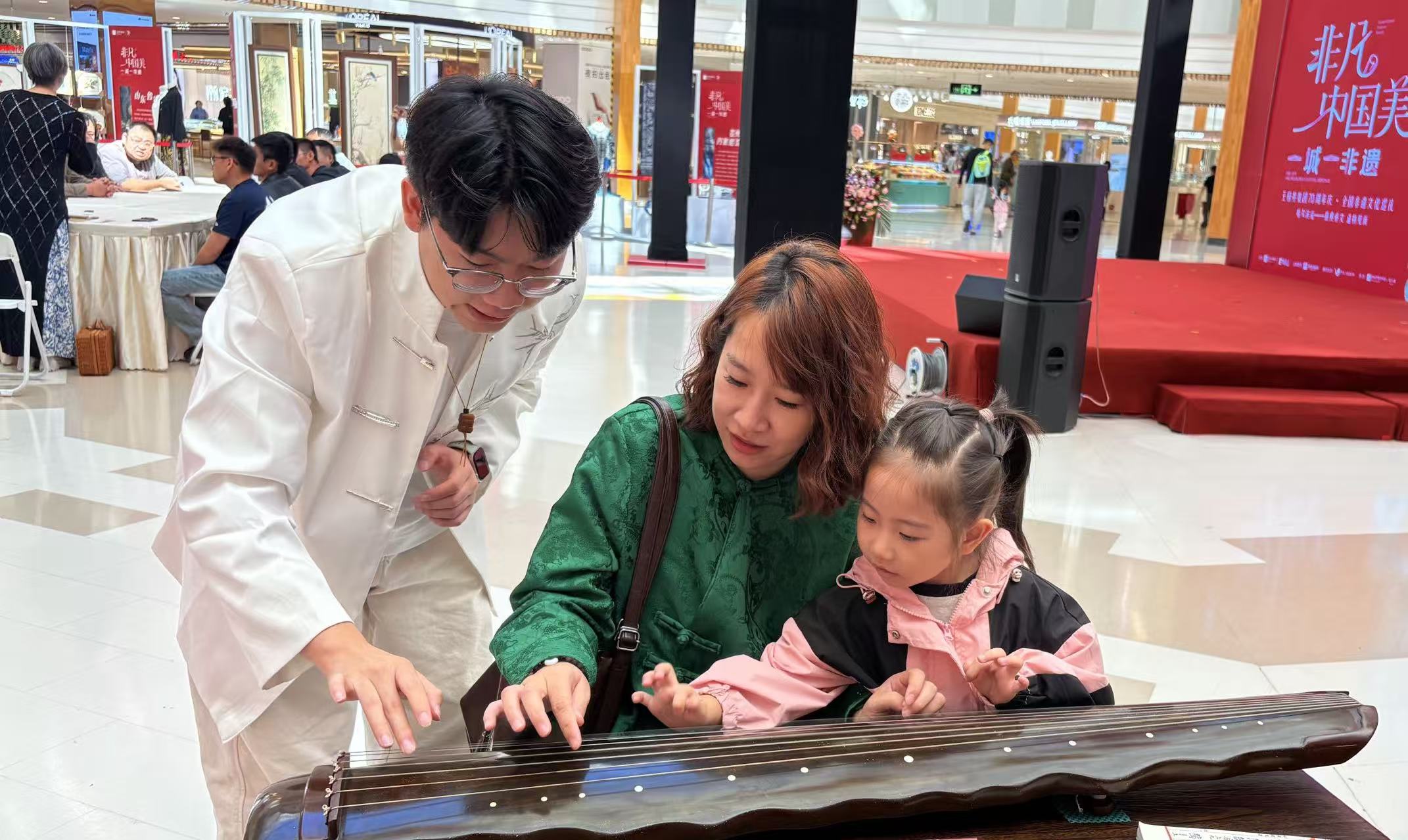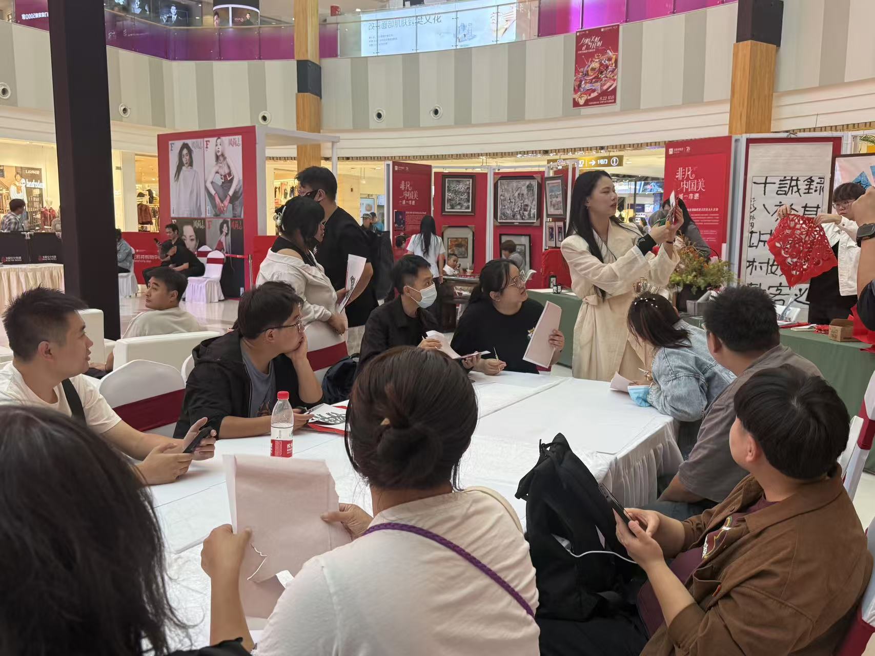 在主题活动日现场,非遗传承人们相继登台展演。古琴、竹笛的经典曲目,清雅乐音回荡于商场之中,吸引大量观众驻足欣赏。香道展演尤为引人入胜,传承人通过一套融汇茶艺与插花的完整仪式,从容展示传统香道的礼仪规范与审美意境。香烟袅袅、茶香淡淡,不少观众沉浸于这重感官与心灵的双重体验,深切感受东方生活美学中的静穆与雅韵。剪纸与书法篆刻互动区同样热闹非凡,老师们不仅表演精湛技艺,更指导观众完成一件件个人作品,实现了传统文化在当代生活中的延续与创新。活动现场气氛热烈,各展位前人流如织。许多观众表示,这种创新性的文化体验方式,让他们对非遗文化的内涵和价值有了更直观和深入的理解。