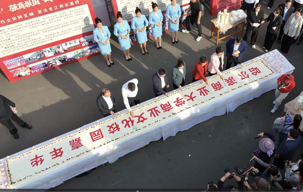 学校为本次商业文化校园嘉年华精心制作了一款长7.6米、宽74厘米的巨型蛋糕。7.6米的长度寓意着新中国成立76周年的辉煌征程,74厘米的宽度则象征着哈尔滨商业大学走过的74载春秋岁月。