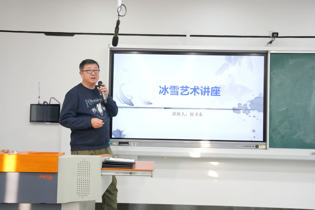 开营仪式邀请到了黑龙江省艺术设计协会冰雪雕艺委会会长侯卫东,哈尔滨师范大学国际美术学院副教授张鑫、黑龙江省美术家协会冰雪艺委会副秘书长庞宇等多位专家,为训练营师生带来精彩的主题论坛分享。黑龙江省艺术设计协会冰雪雕艺委会会长侯卫东“哈尔滨冰雪雕文化的历史与传承分享”。拥有三十余年经验的他从清代“冰灯祈福”习俗讲起,梳理了民国初兴、改革开放后规模化发展,直至今日成为国际艺术盛宴的演进脉络。他指出,冰雕已从渔民简单的冬季娱乐,发展为融合雕塑、灯光与科技的综合艺术。通过老照片与古今工具对比,他生动展示了技艺的传承与革新,并强调传承的核心是在保留文化根脉的基础上持续创新,以适应新时代的审美需求;哈尔滨师范大学国际美术学院副教授张鑫分享了”国际冰雪雕创意设计行业现状与发展”。结合国际参赛经验,阐释创作逻辑与评审标准;黑龙江省美术家协会冰雪艺委会副秘书长庞宇以”冰雪文化发展与冰雪雕创意设计”为题,从文化传播视角解读冰雪雕创作。他提出,“冰雪雕是地域文化的移动名片”,结合哈尔滨冰雪大世界IP案例,阐述如何通过创意设计兼顾作品艺术价值与传播力。她强调好作品需好看、有故事有温度,能引发情感共鸣,还分析了传统、流行文化及地域符号的应用,与学员互动解答相关疑问,拓宽大家创作思路。