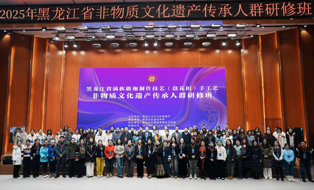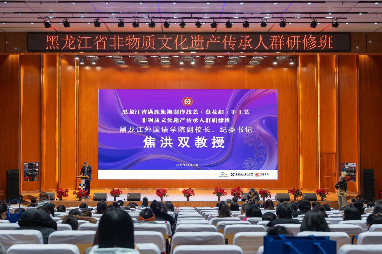 为进一步增强黑龙江省非物质文化遗产的保护与传承力度,提升传承人的专业技能与理论水平,推动贫困边远地区及少数民族地区的传承人和优秀从业者发挥引领作用。12月19日上午,由黑龙江省文化和旅游厅主办、黑龙江外国语学院承办的“省级非物质文化遗产——满族旗袍盘花扣制作技艺研修培训班”在黑龙江外国语学院举行开班仪式。来自全省各地的80名非遗传承骨干、相关工坊代表及院校教师共同参与,开启了为期5天的沉浸式研修学习。