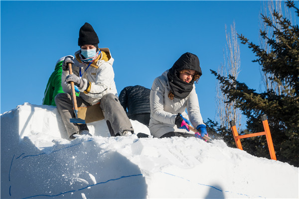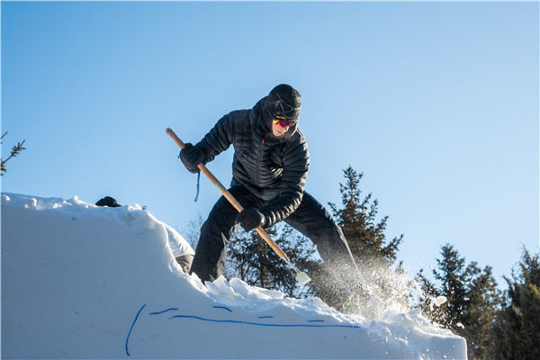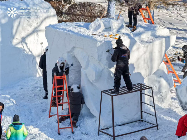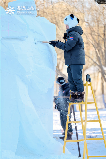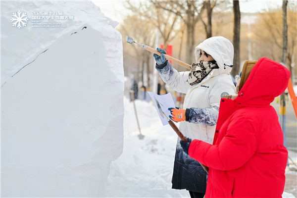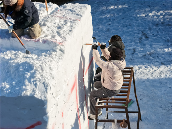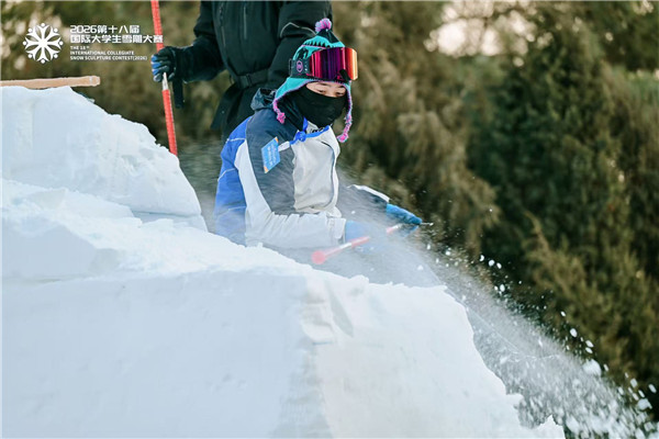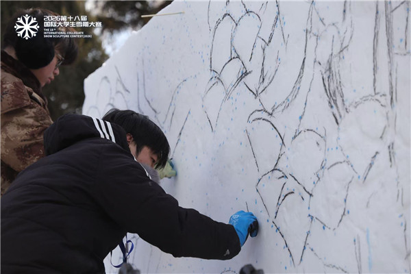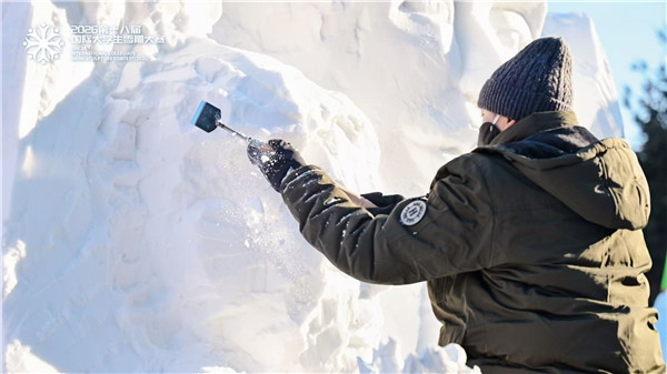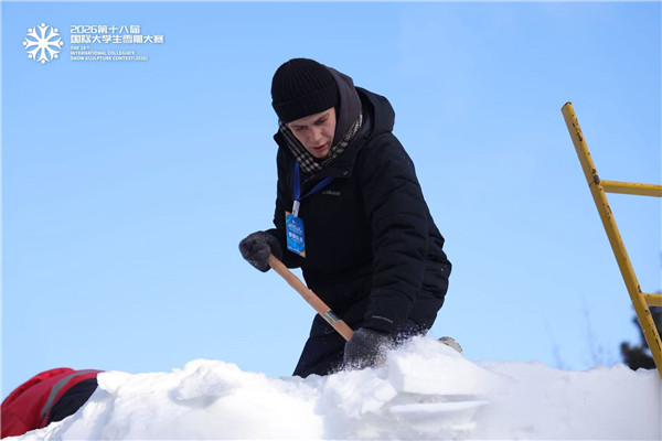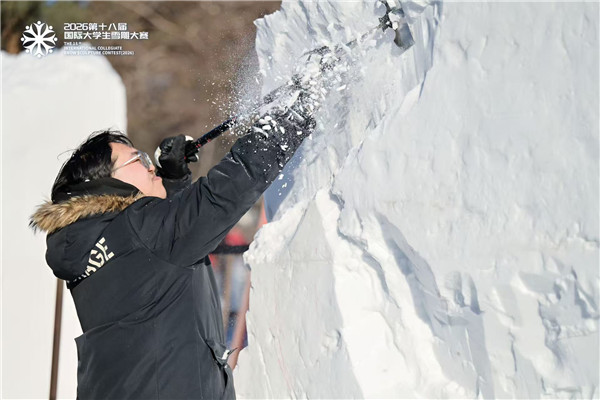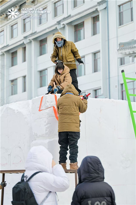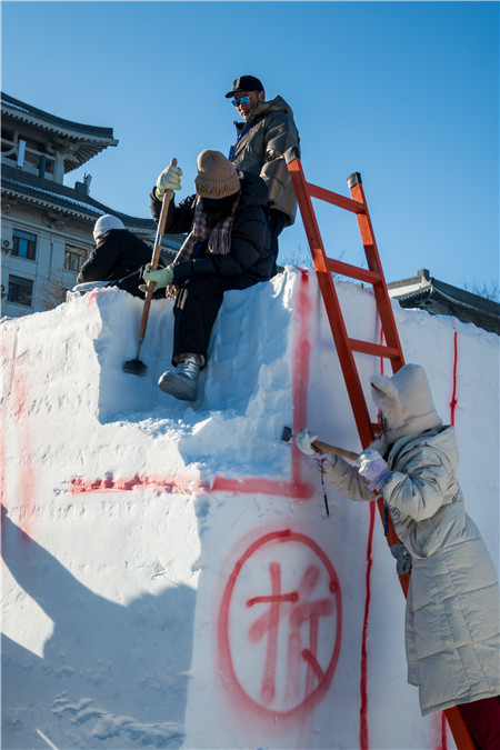 上午八点,大赛正式“开铲”。来自世界各地的青年“雪雕艺术家”齐聚赛场,围绕一方方雪块展开创作。刹那间,铲起雪扬,锯声沙沙,刀尖轻舞,安静的雪场化作一片热情洋溢的创作海洋。梯架之上,有人挥大刀阔斧勾勒轮廓,雪屑如雾飘洒;雪块之侧,有人俯身精雕,专注刻画细微纹理。还有队员围在一起,对着设计图低声讨论。寒风中,他们呼出的白气与飞扬的雪屑交织在一起,冻红的脸颊上却目光炯炯,手中工具与冰雪的每一次碰撞,都在诉说专注与热忱。
