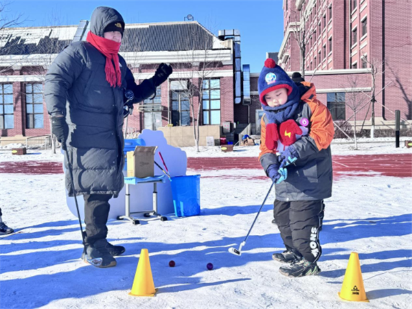 雪地高尔夫赛场,高年级学子凝神挥杆,在精准击球与距离比拼中,锤炼专注力与判断力,展现明心自觉的成长追求。
