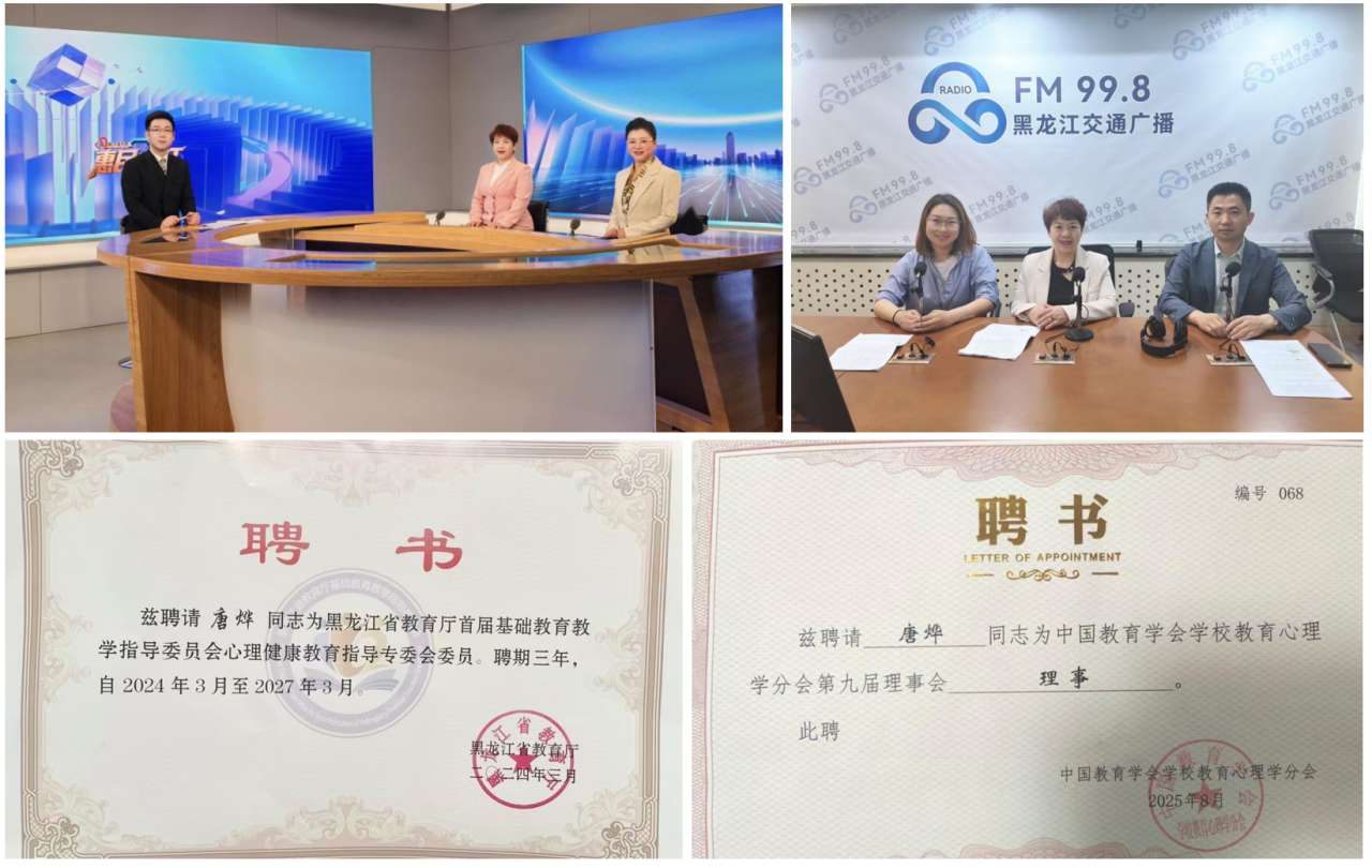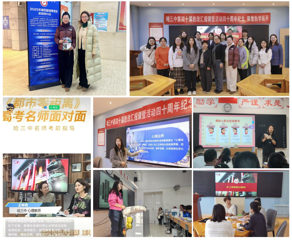 3.深化家校社协同:积极响应《家庭教育促进法》,心理教研室联合学生发展中心,年内举办4期家长心理沙龙,为家庭教育提供科学指导。唐烨老师作为学科带头人,受聘为教育部及黑龙江省基础教育教学指导委员会心理健康教育专委会委员,王甲秀老师多次向内蒙古教师团队分享经验,多位教师通过电视台、广播、网络平台开展公益心理科普,彰显了名校的社会责任与辐射引领作用。