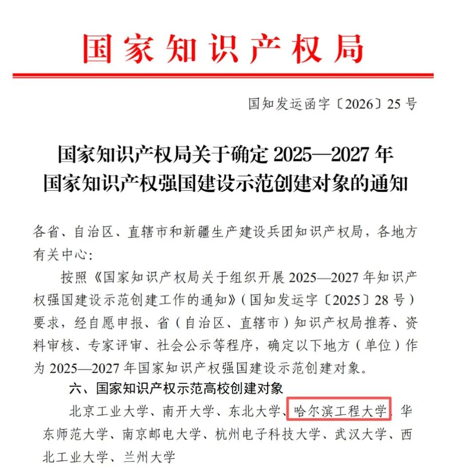 哈工程加快推进科技创新成果向现实生产力转化,专利成果转化与知识产权工作再结硕果。近日,国家知识产权局公布了2025—2027年国家知识产权强国建设示范创建对象和2025年第三批专利转化运用优秀案例评选结果,学校入选“国家知识产权示范高校创建对象”,推荐案例《智能工具赋能专利评估和供需对接,推动聚丙烯蜂窝材料在多个产业领域中广泛应用》入选“2025年第三批专利转化运用优秀案例”,是黑龙江省唯一入选案例。
