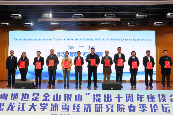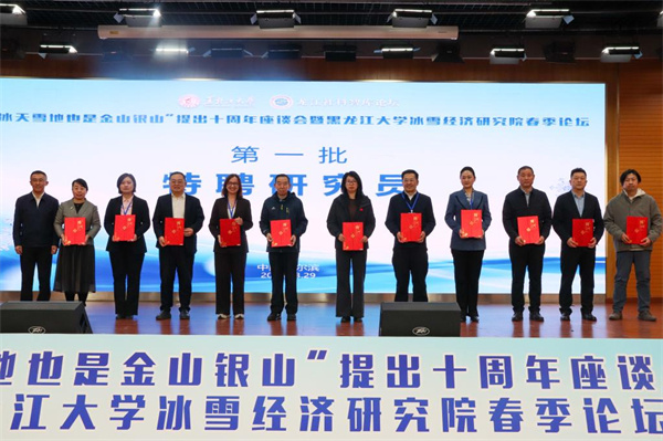 黑龙江大学党委书记、冰雪经济研究院院长迟宝旭为特聘研究员、特聘专家颁发聘书。