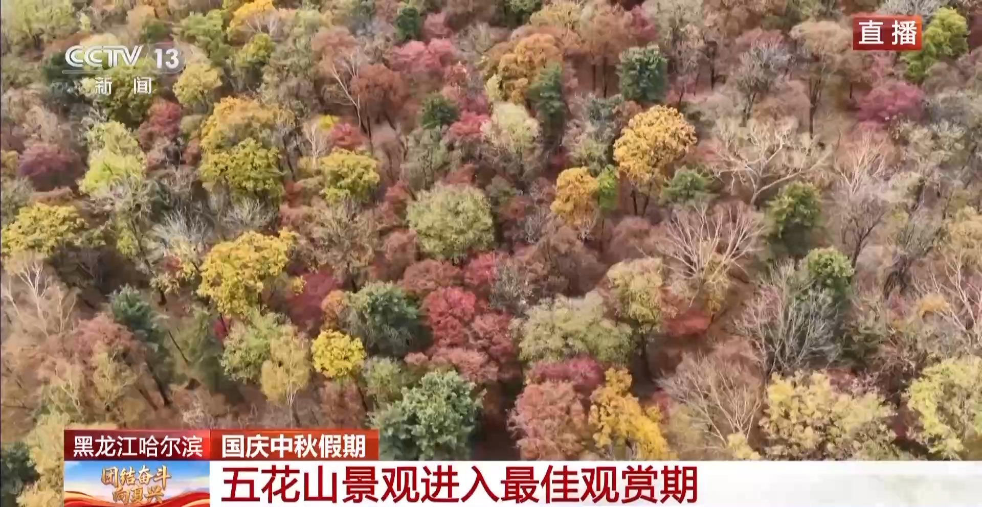 总台记者王海樵:我所在的位置位于黑龙江省哈尔滨市阿城区的吊水壶风景区,眼下这里的五花山景观进入最佳观赏期。此时的山林之间已经是五彩斑斓,形成了一幅绝美的秋日图景。