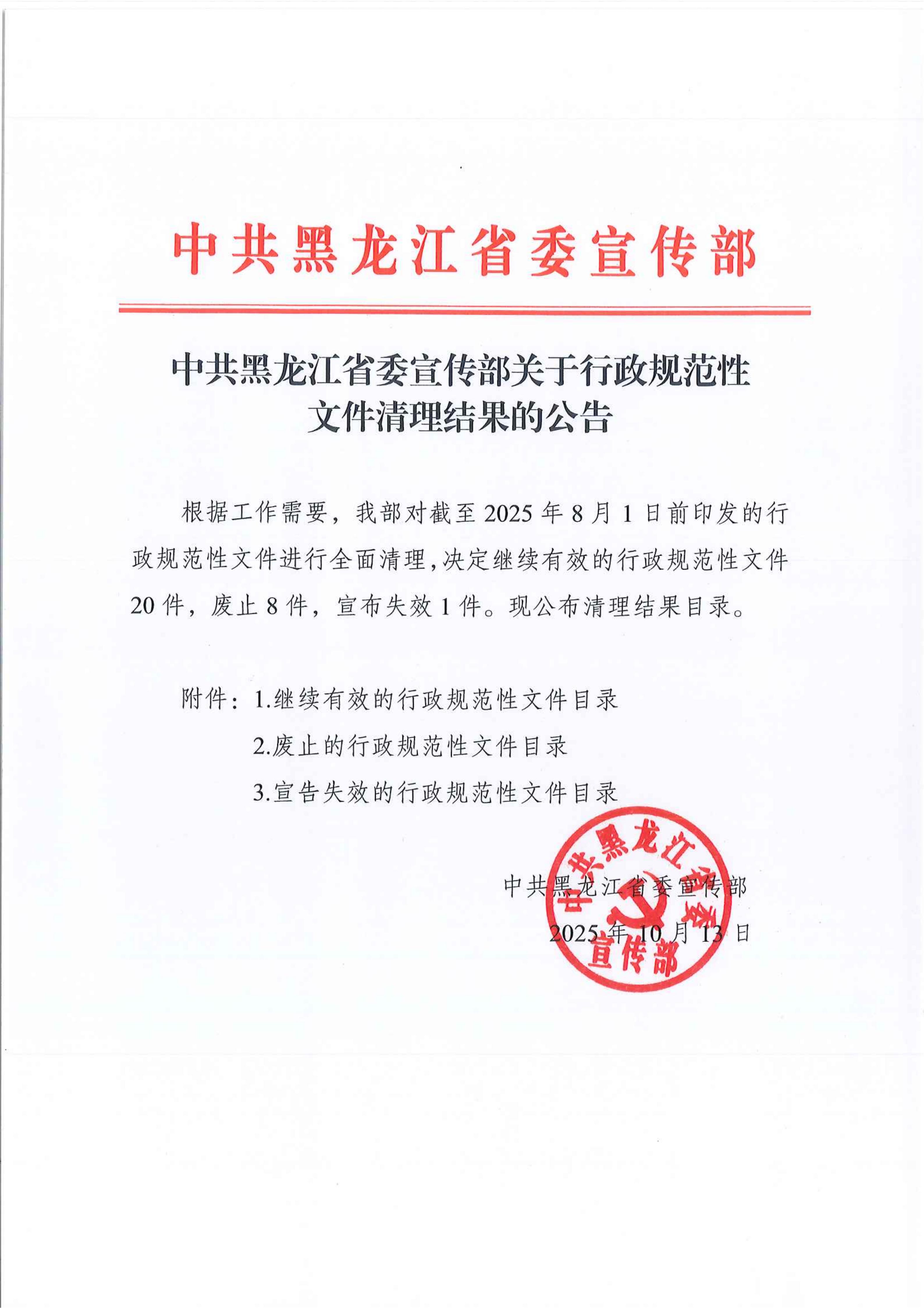 中共黑龙江省委宣传部关于行政规范性文件清理结果的公告