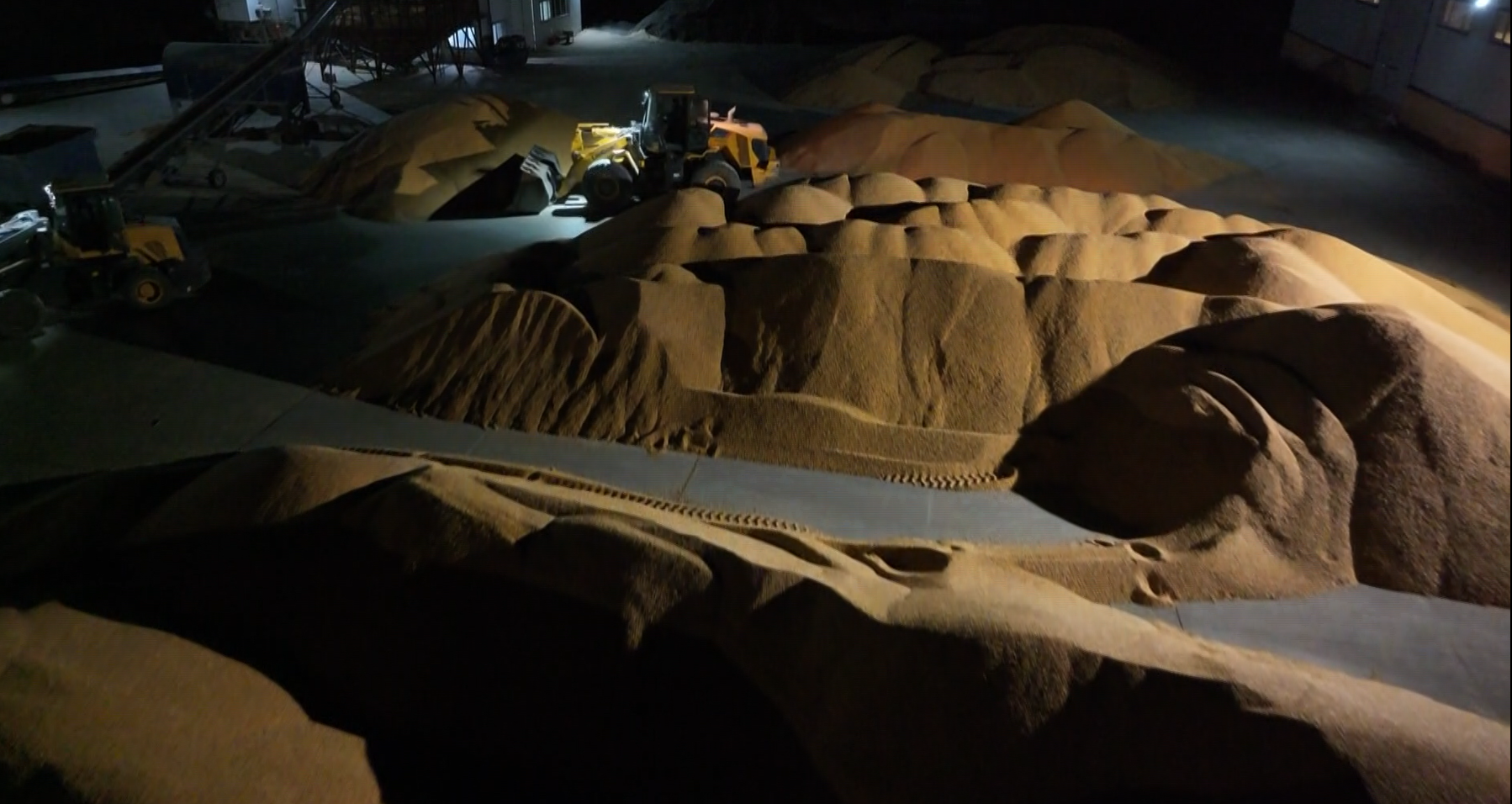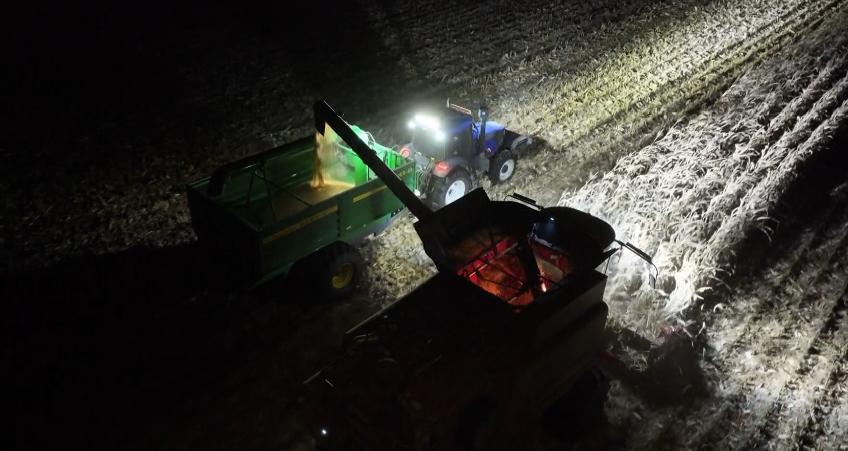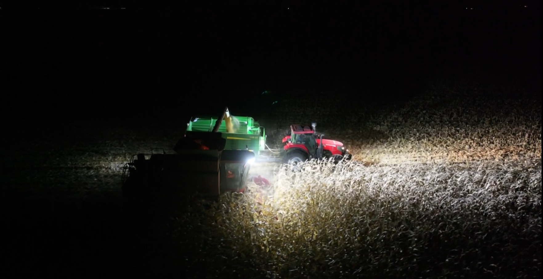 青河镇东明村的玉米地里,机声隆隆。大型玉米收割机开足马力,在黑夜中来回穿梭,一排排挺拔的玉米秆被吞入机腹,金灿灿的玉米粒则如瀑布般倾泻进紧随其后的运输车里。