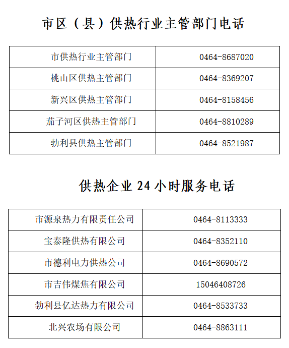 为进一步做好2025-2026年供热期供热保障工作,切实提升供热服务质量,畅通诉求渠道,第一时间解决热用户的供热诉求,现将我市区(县)供热行业主管部门电话及供热企业24小时服务电话公示如下: