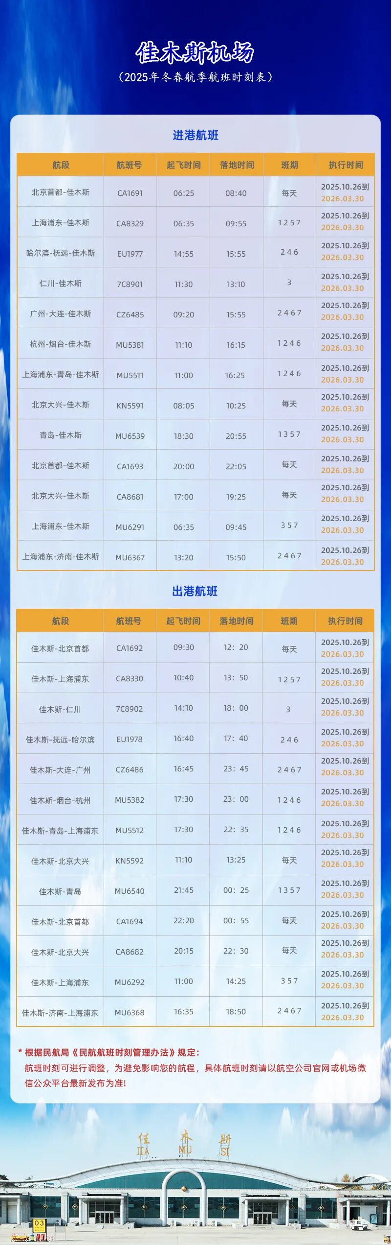 出行注意!佳木斯机场2025年冬春航季航班时刻表来了!