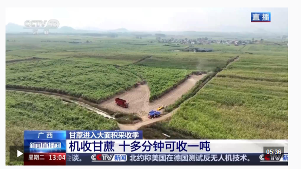 总台记者邓君洋:我现在位于广西来宾国家现代农业产业园的一处糖料蔗基地。在来宾,联合收割机从2014年开始就使用,比较适用于地形平坦、种植面积大的甘蔗基地。