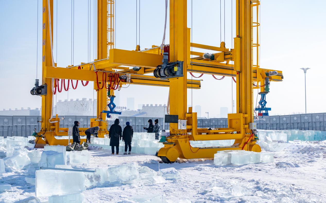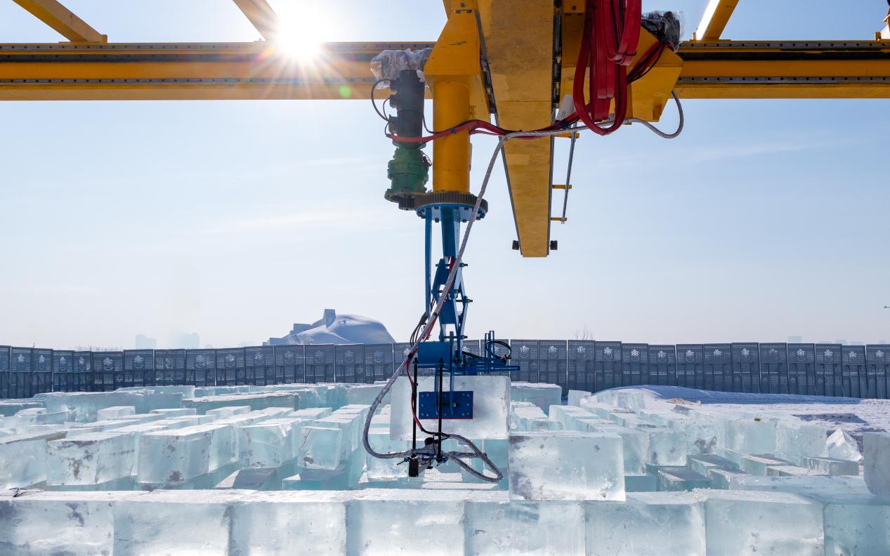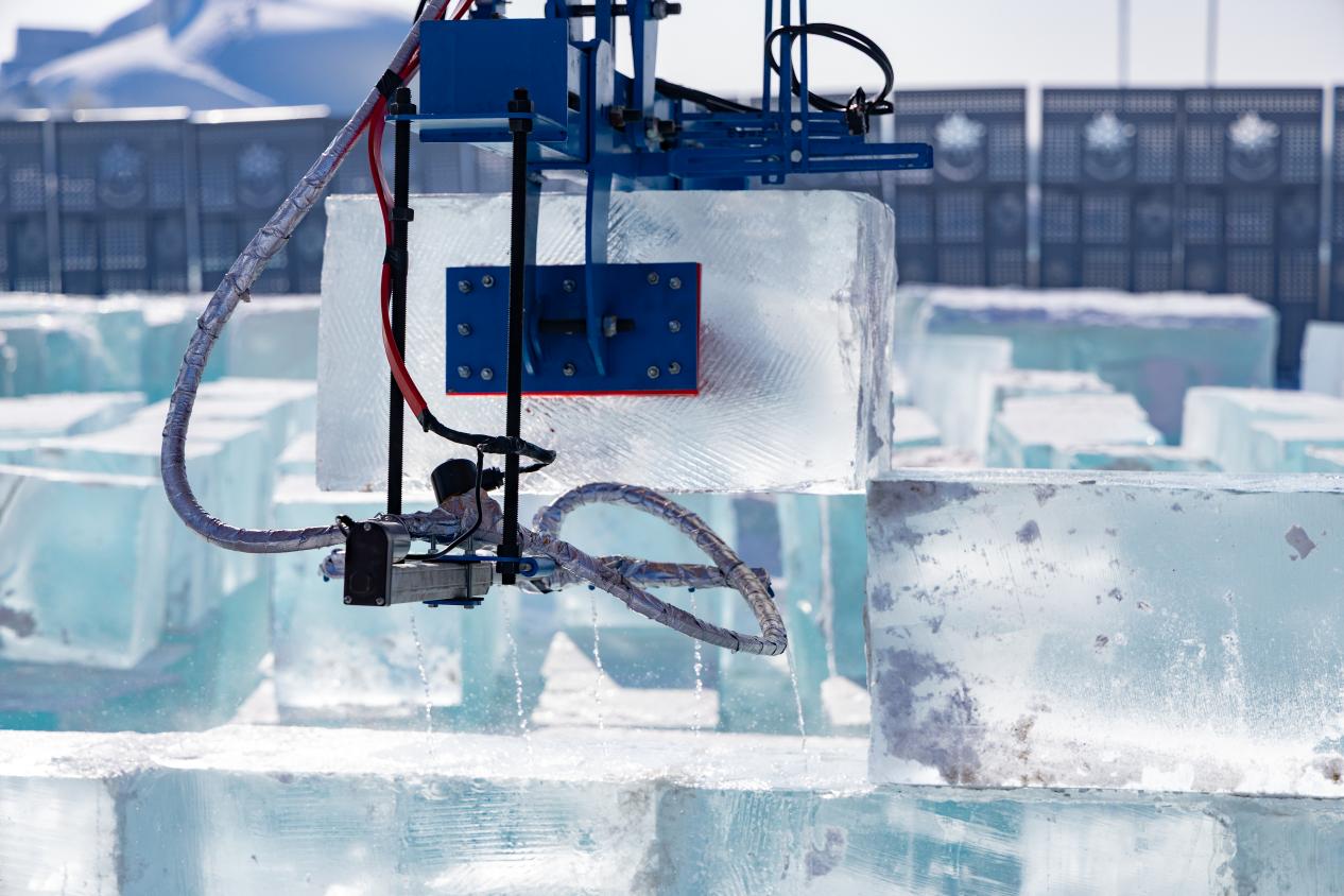 搭建机器人可轻松抓取1吨重的冰块,一旦投入使用可替代人工进行高空作业,降低人力成本和安全风险。这个科技项目的推广和实践,旨在以冰雪建筑为引领,推动冰雪经济发展,助力冰雪全产业链升级。