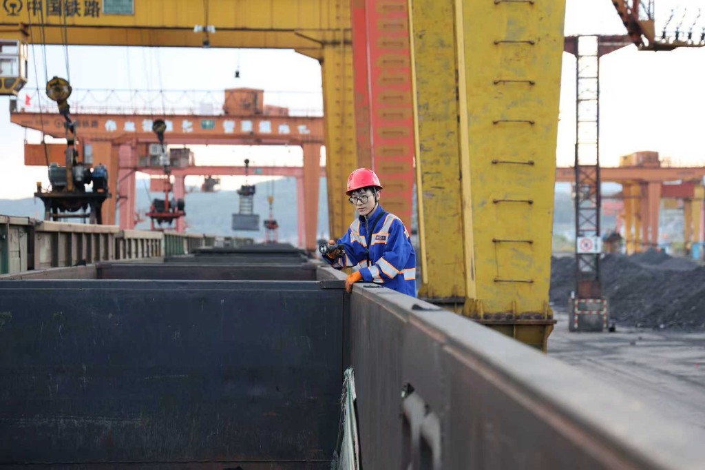 国庆中秋长假,口岸大宗货物运输愈发繁忙。秋风已裹挟着寒意,但黄凯的额角却渗出了细密的汗珠。他俯身仔细检查一节满载煤矿的车辆,确认加固铁丝是否牢靠,车体有无变形,车辆重点部位有无损坏。对讲机里不时传来指令,他需要快速在不同股道间转换,确保列车准点交接。