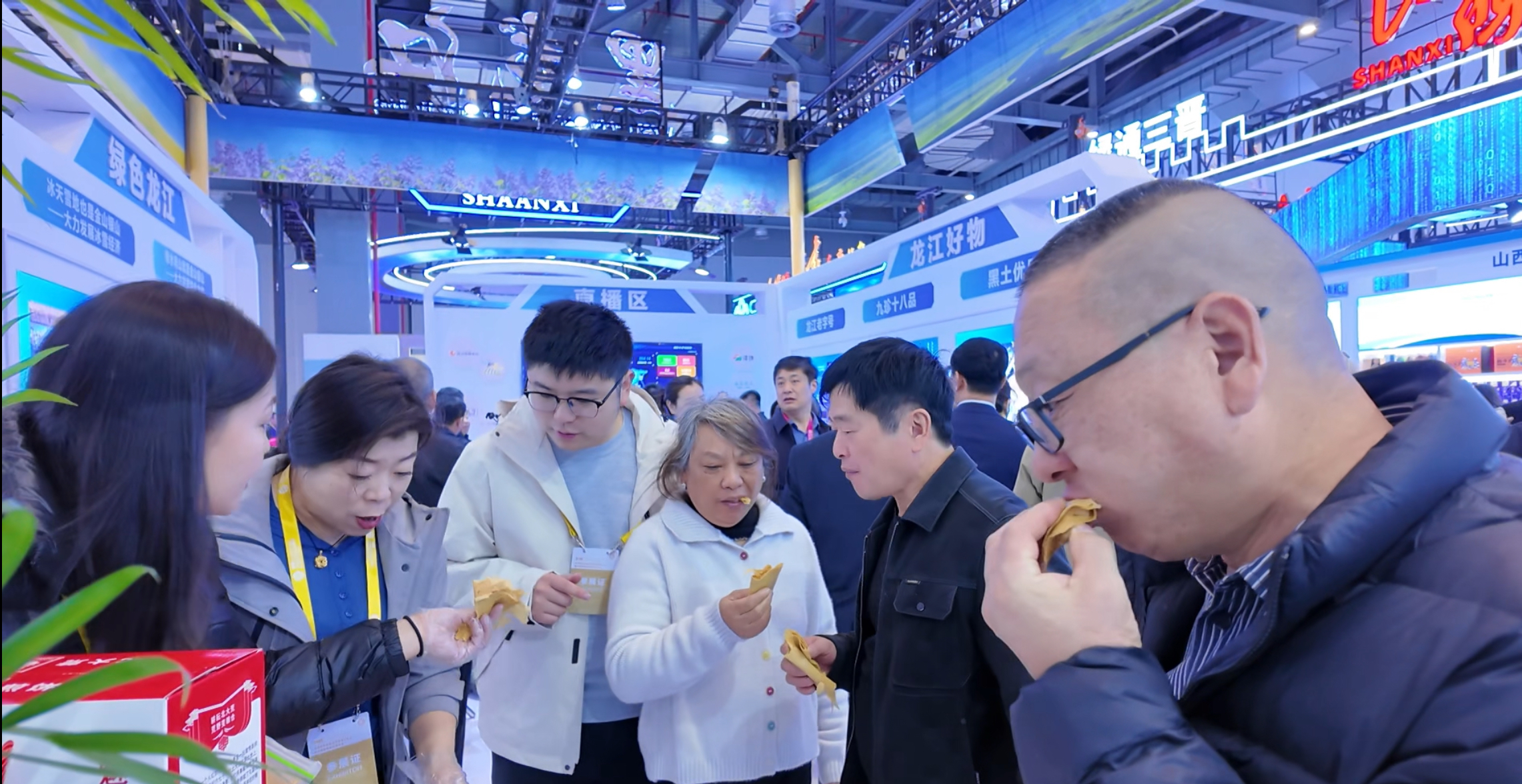 “这是我们生产的杂粮煎饼,您尝尝这黑土地的味道!”宝清县老知青煎饼厂的展位前人头攒动,花生、地瓜、杂粮等多口味煎饼吸引大批客商驻足试吃,排起了品尝长队。