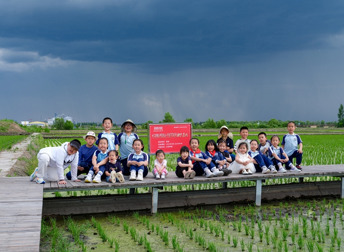 盛夏再入稻田,育苗田已长成郁郁葱葱的稻浪。风一吹,层层绿意翻涌,清冽的稻米香气沁人心脾。稻田里生机盎然:小青蛙蹲在稻叶上鸣叫,小鸭子穿梭稻丛间啄虫施肥,这些“生态功臣”与黑土地共同孕育出水稻本真风味。我们穿梭田埂,观察稻穗抽芽、稻叶舒展,指尖轻触带露禾苗,感受生命蓬勃生长的力量。站在观景台远眺,紫色、翠绿、鹅黄的稻苗交织成稻田画,“珍惜粮食”四个大字熠熠生辉。老师说,这是农民伯伯以大地为画布、稻苗为画笔,经数月规划栽种而成,每一株稻苗的间距都暗藏章法,尽显农耕的创意与诗意。