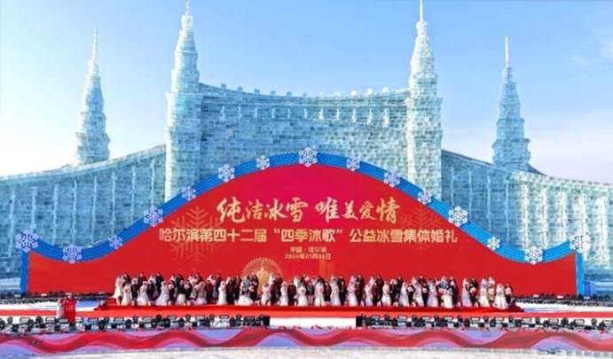 冰筑良辰承佳偶,雪映初心证良缘。2026年1月6日,作为哈尔滨国际冰雪节标志性活动之一的第四十二届“四季沐歌”公益冰雪集体婚礼盛典,在梦幻璀璨的哈尔滨冰雪大世界圆满落幕。来自黑龙江、吉林、辽宁、山西、浙江、贵州、山东、广东、陕西、安徽、河南、河北、重庆、青海、云南、上海、内蒙古、四川18个省、自治区和直辖市的42对新人,怀揣着对爱情的憧憬与对冰雪的向往,在这座“冰雪之都”许下相守一生的誓言,让纯洁冰雪成为爱情最珍贵的见证。央视新闻、新华社、网易、哈尔滨经济广播、极光新闻等媒体全程直播婚礼盛况。