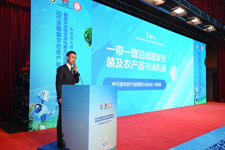 哈尔滨市农产品营销行业协会副会长付园森带来“一带一路”沿线国家包装市场机遇的分享。他指出,数字包装不仅赋能国内产业,更将成为中国品牌“扬帆出海”的利器,企业应把握“一带一路”沿线国家的包装市场机遇,积极拓展海外市场。